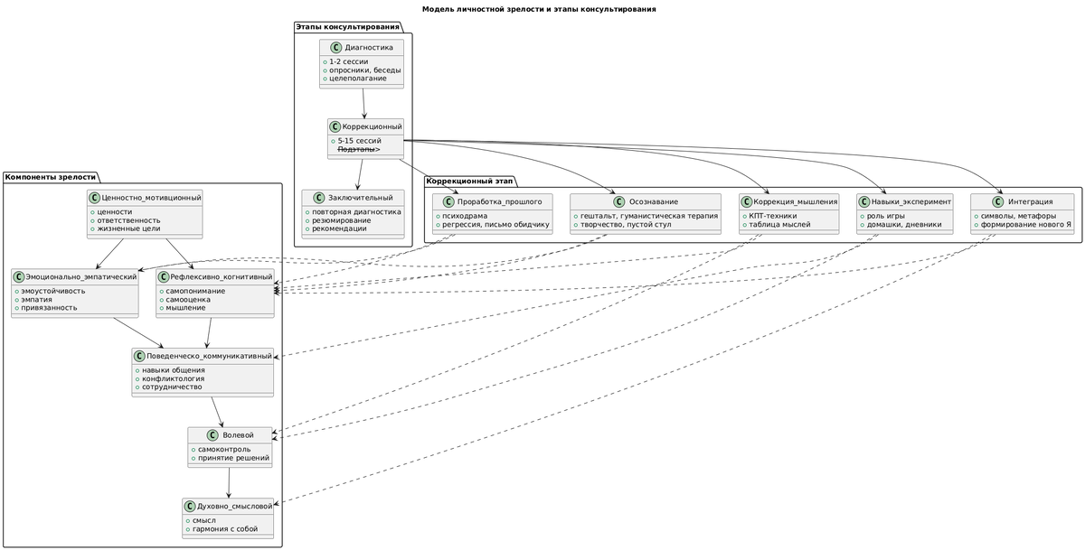 1. Диагностико-целевой этап. На 1–2 сессиях происходит установление контакта, сбор информации (психодиагностика отношений, жизненная история, текущее состояние зрелости – с помощью опросников и беседы). В конце этапа вместе с клиентом формулируются цели работы – как общие (например: “стать увереннее в себе и научиться строить доверительные отношения”), так и конкретные краткосрочные (например: “наладить диалог с женихом по поводу планирования свадьбы без ссор”). Результат – индивидуальный план консультирования.