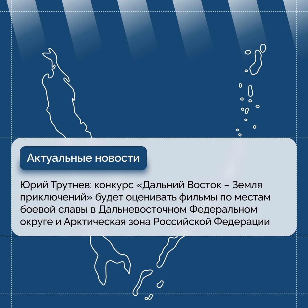 Юрий Трутнев: конкурс «Дальний Восток – Земля приключений» будет оценивать фильмы по местам боевой славы в Дальневосточном Федеральном округе и Арктическая зона Российской Федерации Жюри Всероссийского конкурса «Дальний Восток – Земля приключений» принимает фильмы о путешествиях по региональным маршрутам по местам боевой славы в субъектах, находящихся в пределах Дальневосточного федерального округа и Арктической зоны России. Для этого создана специальная номинация «Тропами Победы». В этом году наша страна отмечает 80-летие Великой Победы. Мы должны передавать память о подвиге отцов и дедов, отстоявших Родину и победивших фашизм, от поколения к поколению. Дальний Восток и Арктика внесли значительный вклад в Победу, обеспечив страну ресурсами, защитив транспортные пути. Северный морской путь стал жизненно важной артерией для поставок грузов и снабжения тыла. На Дальнем Востоке закончилась Вторая мировая война. Дальневосточники и северяне, кто на фронте, кто в тылу, как могли приближали
