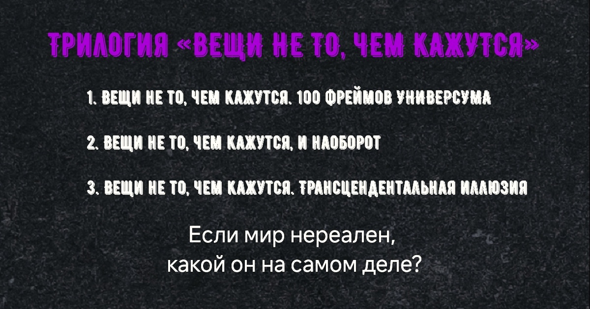 Результатом 5-летней кропотливой научно-исследовательской работы стала последовательная публикация трёх научных монографий, в которых осуществляется попытка приоткрыть вуаль тайны над феноменами мироздания. В трилогии «ВЕЩИ НЕ ТО, ЧЕМ КАЖУТСЯ» рассматриваются наиболее актуальные проблемы современного научного знания от возникновения Вселенной и зарождения жизни на Земле до возможностей межзвёздных перелётов, путешествий во времени и перспектив развития искусственного интеллекта.