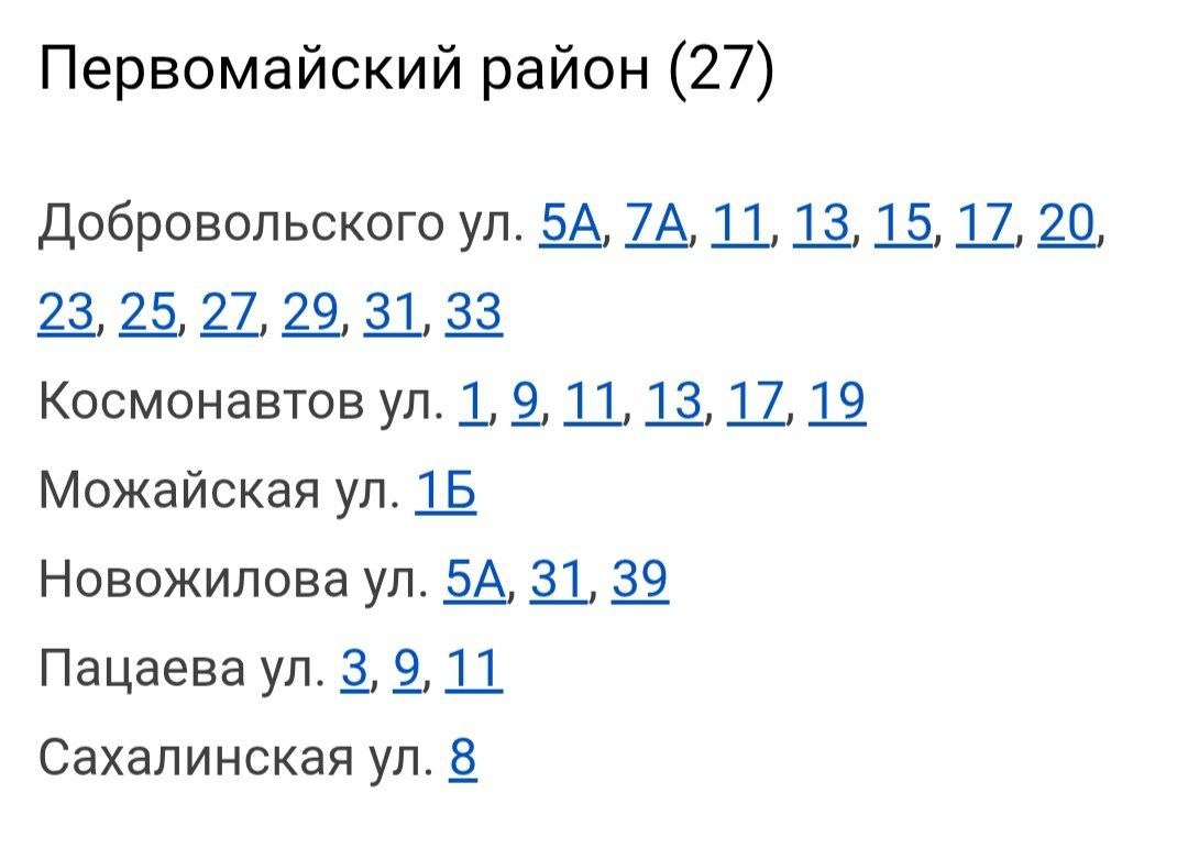 ⚡️Массовое отключение горячей воды. МЦУ подскажите,с чем связано? Первомайский район Беляева ул.2, 3, 4, 5, 6, 7, 8 Борисенко ул.100, 100А, 100Б, 104А, 106А, 108, 108А, 110, 17, 19, 19А, 21, 58, 60, 62, 64, 66, 68, 70, 9, 92, 94, 96 Волкова ул.1, 11, 1А, 3, 5, 7, 9 Добровольского ул.11, 13, 15, 17, 20, 23, 25, 27, 29, 31, 33, 39, 43, 45, 47, 5А, 7А, 9 Космонавтов ул.1, 11, 13, 17, 19, 21, 23, 25, 27, 3, 9 Можайская ул.1Б Монтажная ул.11, 11Б, 13, 15А, 2, 2А, 3, 4, 5, 7 Новожилова ул.3, 31, 39, 5А Пацаева ул.11, 3, 3А, 5, 7, 9 Сахалинская ул.11, 15, 19, 21, 25, 27, 29, 30, 31, 32, 33, 34, 35, 36, 37, 38, 41Г, 42, 43, 48, 49, 50, 52, 53, 54, 55, 56, 57, 58, 59, 5А, 61, 8 @yurovmedia