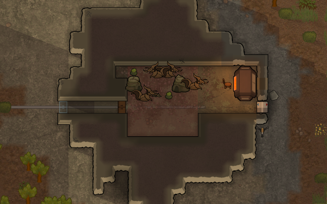 Гор вокруг ещё достаточно, и в них по-прежнему удаётся находить полезные ресурсы, а это значит, продолжаем копать горы в свободное от выживания время. К тому же Оранж уже задумывается о том, что раскопанные пространства вполне можно использовать для каких-нибудь помещений. Может, переоборудовать под камеры для пленников или в рабочие помещения.