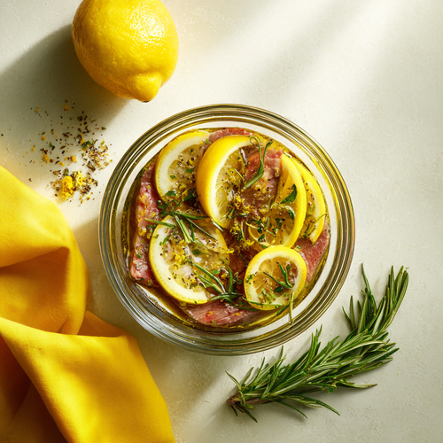 * Что снимать: Мясо в стеклянной миске, залитое маринадом с видимыми ломтиками лимона и травами.