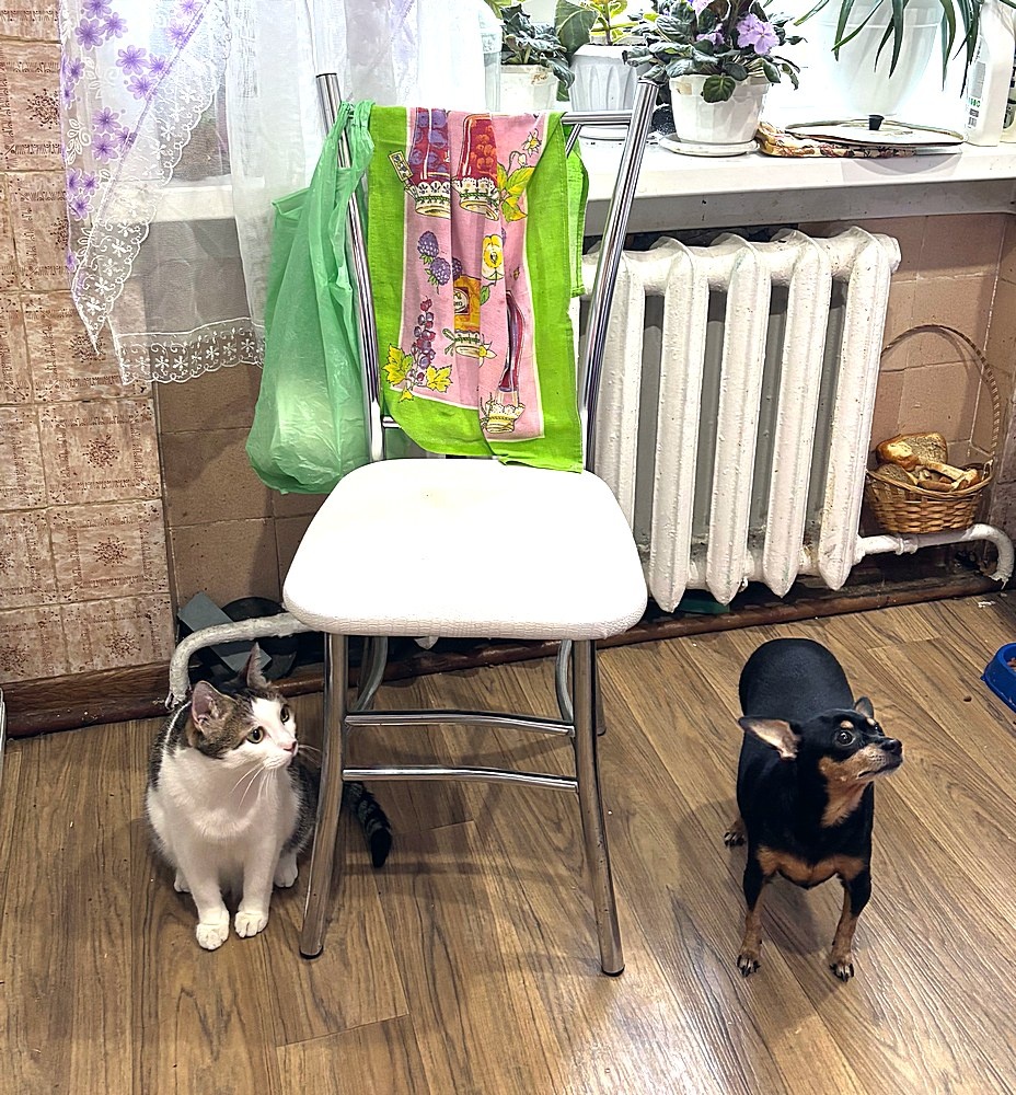 Она ест его еду, он выпивает её воду. Они борются за место возле хозяйки. Старый кот Кузя и пожилая собака породы той-терьер Милка. Они знают друг друга более десяти лет, но всё равно иногда вступают в драку, пока хозяйка не отходит тапком одного и второго. День животных начинается с пробуждения хозяйки. Они знают, куда она направляется, и бегут впереди неё – на кухню. Кузя начинает истошно орать, понимая, что еду дадут, но на всякий случай. Милка смотрит на кота и тоже ждёт, когда ему насыпят сухого и «мокрого» корма. Она любит жидкий. Из сухого выбирает – не все сухарики нравятся. При этом, напрочь отказалась есть сухой корм для собак. Какое-то время Милка стоит рядом с котом. Точнее – «над душой». Поэтому Кузя ест быстро и немного, потом убегает в туалет. Собака же доедает «мокрый» и начинает ковыряться в сухом. К тому моменту, как кот сделает свои «вонючие» дела, хозяйка наводит кофе, и ругается на кота, когда запах доходит до кухни. Кузя же, медленно подошедши к коридорному зерка