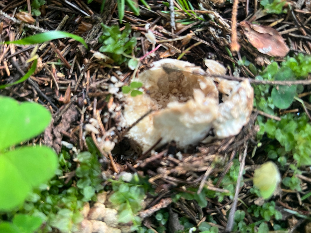Следующая цепочка грибниц вдоль опушки, на первой же вижу останки молодого белого, он не сбит, а почти подчистую сьеден слизнями.