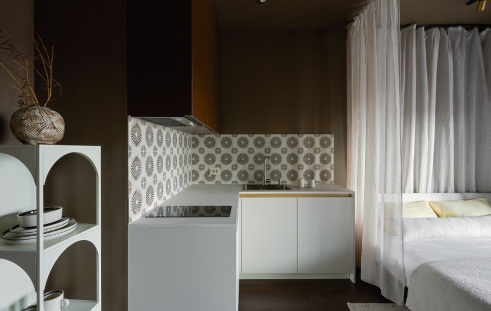 Нетривиальный интерьер в квартире с ремонтом от застройщика Место: Санкт-Петербург Тип дома: Новостройка Метраж: 24,4 кв. м Год реализации: 2025 Комнаты: 1 Cанузлы: 1 Высота потолков: 2,6 м Бюджет: 850 тыс. рублей Дизайн: Нина Симонова Стилист Нина Симонова Фото: Анна Скударь Дизайнер Нина Симонова необычно и стильно обустроила квартиру, которая предназначена для посуточной сдачи гостям и жителям Санкт-Петербурга. Основной целью стало создание нетривиального интерьера, который выгодно выделялся бы среди конкурентов, при минимальных затратах на реализацию. Внутренние стены квартиры были оставлены без изменений, а значительная часть работ происходила на основе готового ремонта от застройщика. Планировку от застройщика не меняли, мокрые зоны остались в своих границах. Благодаря правильной расстановке мебели удалось разместить всё необходимое: в комнате есть кухня, спальня, столовая зона, а также место для хранения и зона для телевизора. На балконе обустроили уютное место для отдыха, также