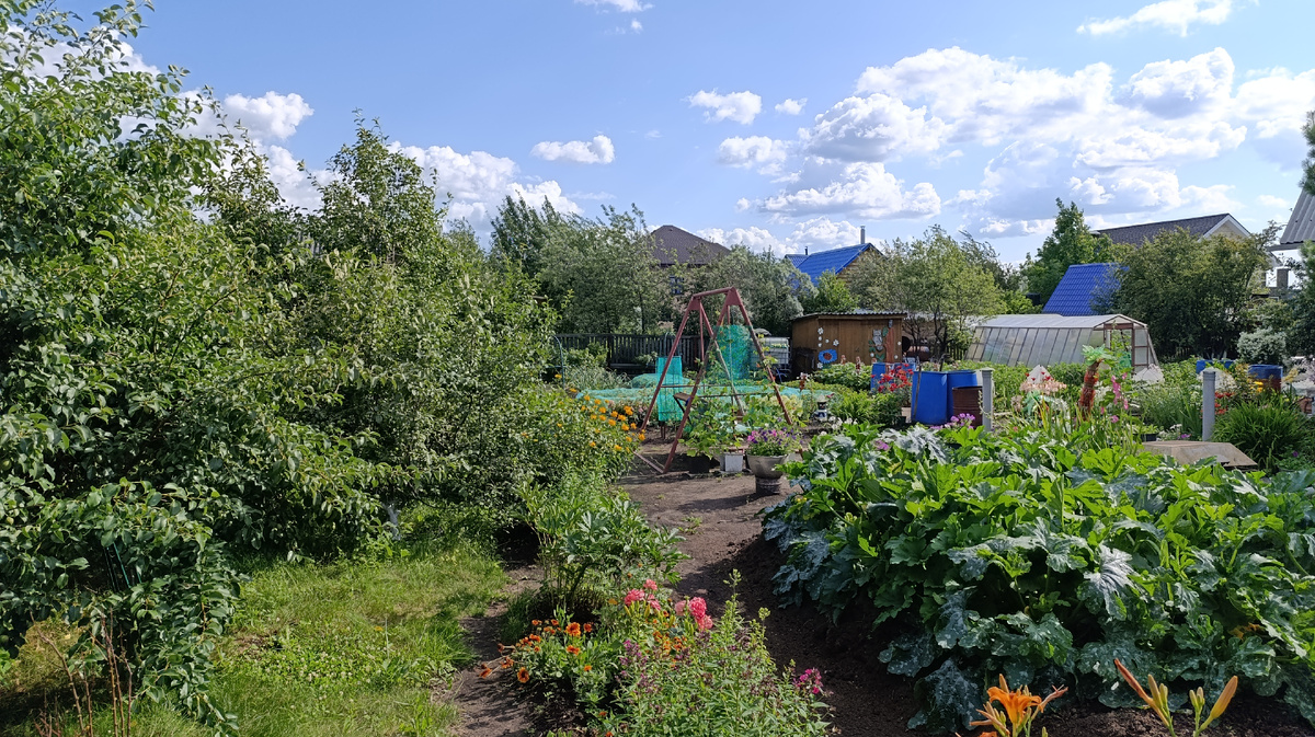 Как бы ни был хорош чужой сад, свой, всё равно, роднее. Мы с дочкой пошли прогуляться по СНТ её свёкров. Так интересно заглянуть за заборы. Там, где это возможно, конечно. СНТ старое, находится в черте города, сюда даже обычный городской рейсовый автобус ходит. Участки всего по 4 сотки, но, похоже, этого хозяевам хватает. У сватов та же история. 4 сотки. Но участок они покупали пустой не так давно и дом выстроили новый. Он без отопления, может сделают ещё, когда газ проведут. Приятно, конечно, когда всё новое. Вид внутри. Сватья увлекается вышивкой и просто отлично вяжет. Это я вам как вязальщик со стажем говорю. У меня, например, никогда не получалось так аккуратно прикеттлевать воротник. А игрушки какие у неё крючком! Чудо. Небольшая банька, тепличка. Небольшой огород. Хорошие металлические ограждения грядок. Есть и ягодные кусты, и яблоньки, и картошка. Ну и клумбы конечно. Всё очень мило и приятно. Но своё, всё равно, к сердцу ближе, как я уже написала в начале статьи). Собрались