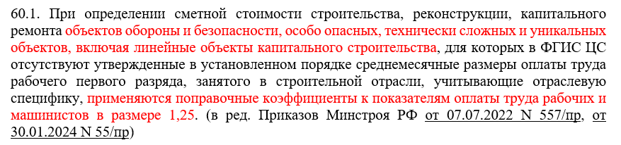 2) в случае, если в наименовании ССРСС указан объект обороны и безопасности, особо опасный, технически сложный или уникальный объект, включая линейный объект капитального строительства, являющийся комплексным, а в состав ССРСС включены виды объектов капитального строительства, не имеющие отраслевой специфики, их сметная стоимость определяется без использования поправочного коэффициента к показателям оплаты труда рабочих и машинистов в размере 1,25, учитывающего отраслевую специфику строительства объектов.