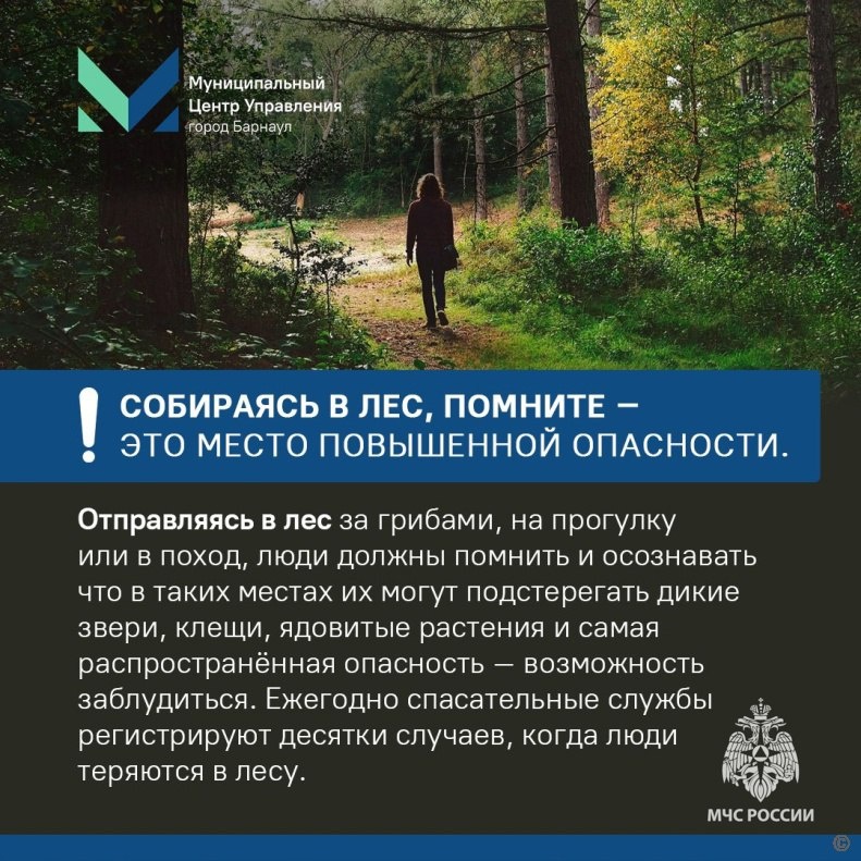 🌲🍄Собираясь в лес, помните, что это место повышенной опасности 👉 Отправляясь в лес за грибами, на прогулку или в поход, люди должны помнить и осознавать, что в таких местах их могут подстерегать дикие звери, клещи, ядовитые растения и самая распространенная опасность - возможность заблудиться. О правилах безопасности напоминает официальный сайт города Барнаула. @mchs_altkray