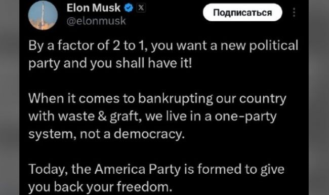 Илон Маск официально объявил о запуске «Американской партии» (American Party) — новой политической силы, которая будет конкурировать с Республиканской и Демократической.