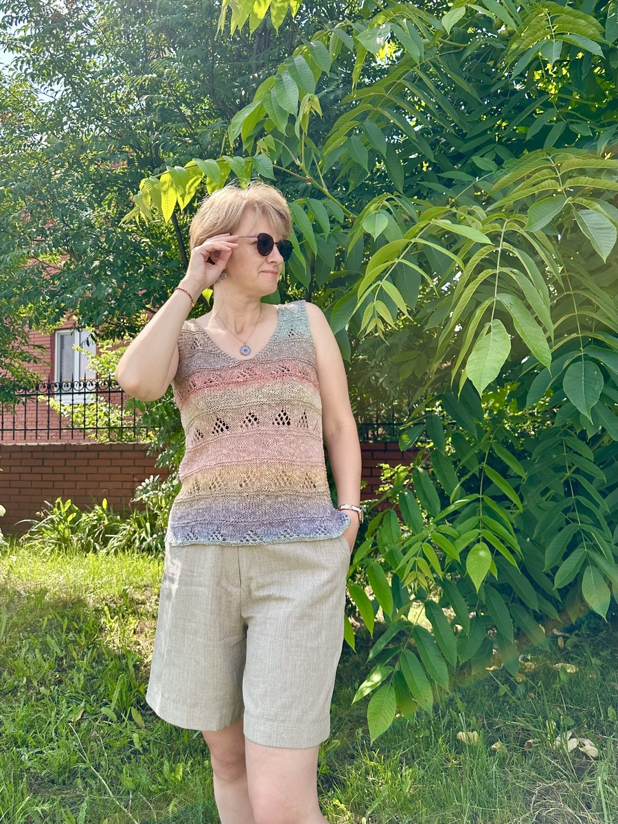 Всегда рада получать от вас отклики, мои дорогие подписчики! Вот только что "прилетел" фото-отчёт от моей любимой подписчицы, Ольги Барыкиной. Вы уже знакомы с этой вязальщицей. У неё потрясающая способность не копировать мои изделия, а изменять их под себя. И всегда это получается у неё лучше оригинала. Молодец, Оля! Вот такую майку связала Ольга, основываясь на мой мастер-класс по вязанию туники "Бермуды". Оля всегда красиво фотографирует свои изделия, тщательно продумывает фон и ракурс. А сама - сногсшибательная фотомодель! Для майки Оля взяла другую пряжу - и другого производителя, и другого окраса (секционного). Пряжа премиум класса - Linello Lang Yarns (40% лен, 32% хлопок, 28% вискоза, 280 м в 100 г),. Очень дорогая! Но это того стоит, согласитесь. На майку понадобилось 2 мотка. Мы видим, что в изделии по-новому вывязан верх изделия, появились лямки, и майечка получилась по-настоящему летней. Мне очень понравилось, как выглядит Ольга в этой майке! Ну, а я хочу напомнить, что МК