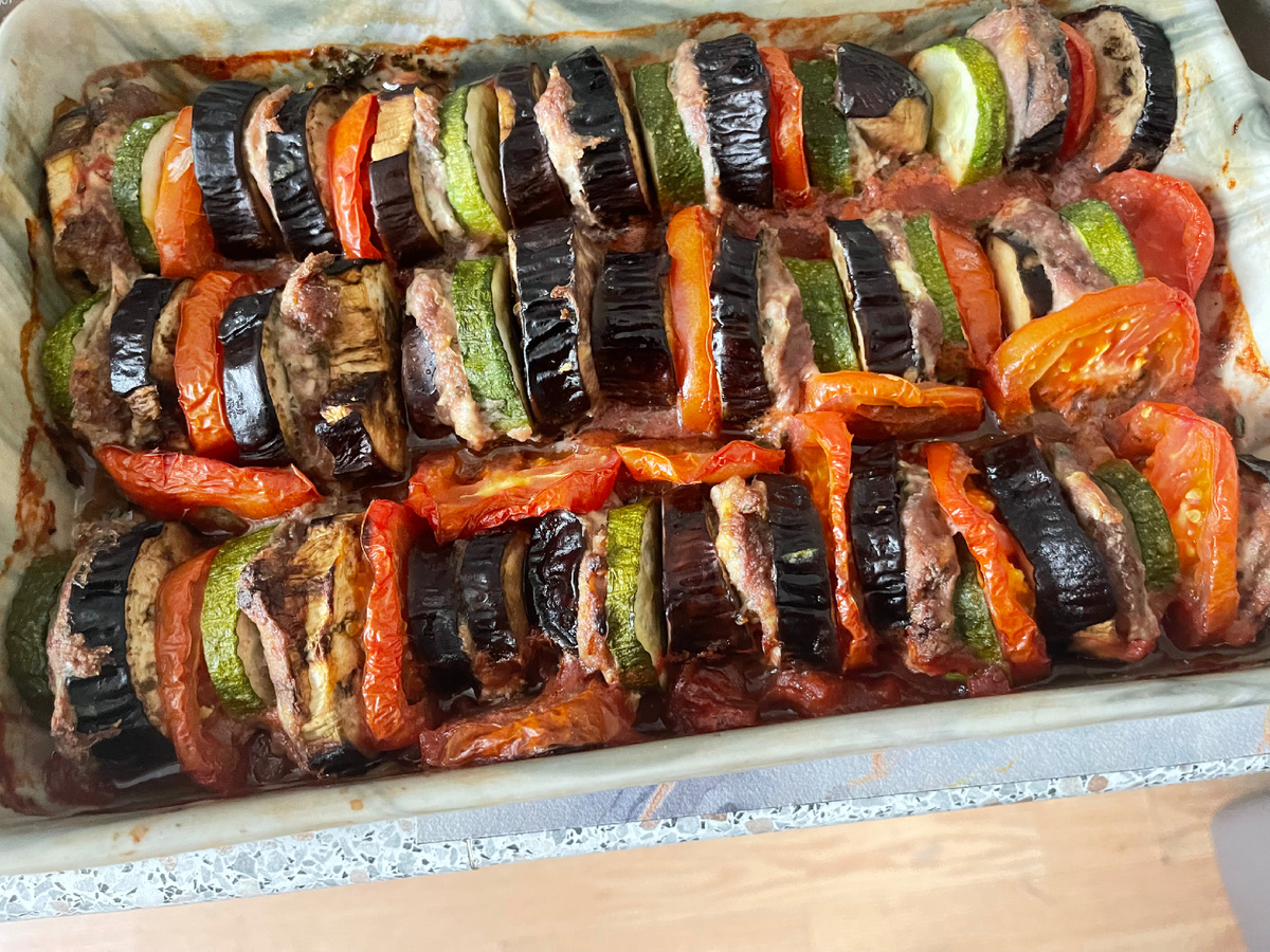 Ингредиенты: Фарш куриный - 400 гр., творожный сливочный сыр - 200гр.,300 мл.протертых томатов или резаных в собственном соку, 1 кабачок, 2 средних баклажана, 3 помидора, растительное масло, соль, перец, орегано. Приготовление: Кабачки и баклажаны нарезать кружочками 0,5см. где-то толщиной . Посыпать их солью, перемешать и оставить на полчаса, чтобы они дали сок, таким образом удалить лишнюю жидкость. Помидоры также нарезаю кружочками. Фарш посолить, поперчить, добавить творожный сыр и хорошо перемешать. Протертые консервированные томаты выливаю в форму, в которой буду запекать. Добавляю соль, перец, сушеный регано, распределяю соус равномерно по форме. Бортики смазываю растительным маслом. Начинаю выкладывать овощи и фарш: друг за другом кружочки овощей и через 2 или 3 следующий намазываю фаршем, затем вплотную несколько кружочков овощей и следующий опять намазываю фаршем. И так пока не закончатся овощи. Всего у меня получилось 3 ряда. Количество рядов зав