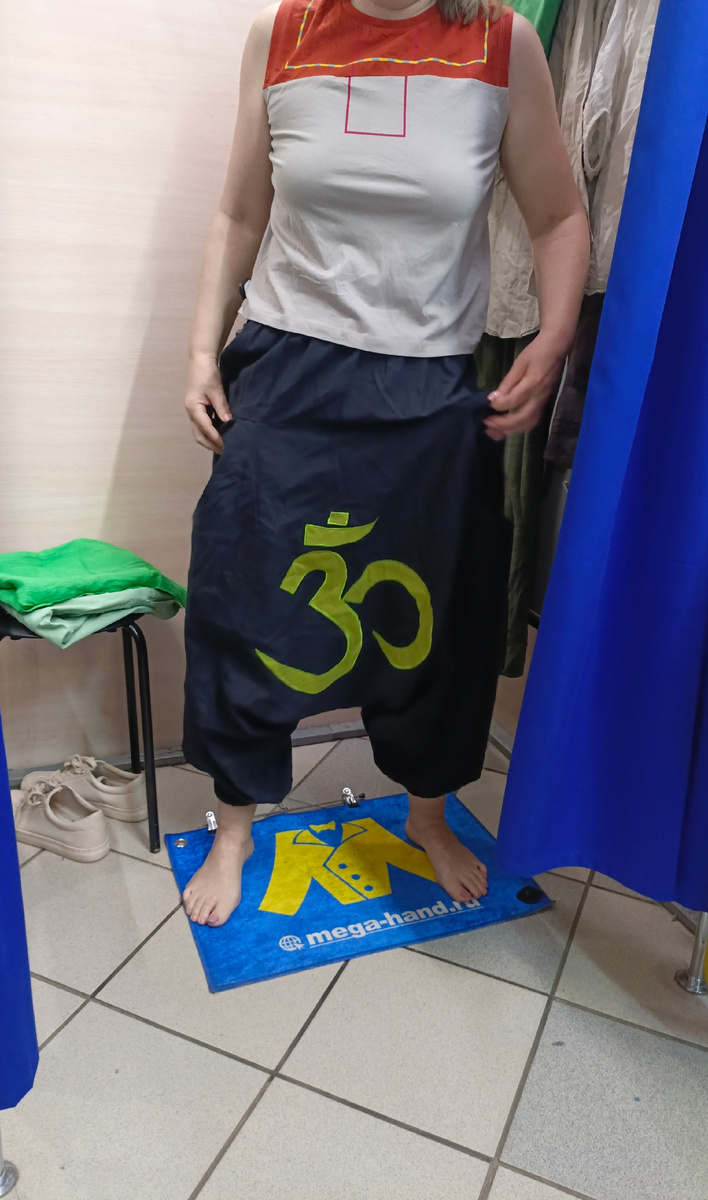 Приветствую всех на своём канале! Близится новый завоз, а я вам еще не всё понравившееся показала с нынешнего. С каждым разом нравится всё больше и больше одежды. Приходится призывать здравый смысл и жабу 🐸. И хоть они не всегда спасают, но иногда всё же такое случается 🤷 🤗😁. И Слава Богу! Традиционно - с покупки. Хотелось купить 3-4 вещи, или даже больше (почти всё, что сегодня фигурирует в статье, изначально было моими хотелками) но благодаря вышеперечисленным ( мозгу 🧠 и жабе 🐸) купили только одну👍😁. Очередные шаровары😁. Обожаю такие штаны. Про них я обычно говорю - "Хезали впятером, а носить одной приходится". Так они выглядят в обычном состоянии, а не на показ))) то есть находятся в свободном состоянии, а не растягиваются мною во все стороны😊. Тактильно показались льняными, но нет - плотный хлопок. Состояние идеальное и вроде бы даже новые. Пытались перевести иероглифы Непальского языка в фотопереводчике нет. С китайского не переводит😱. Вот такая незадача 🤣. И бирк