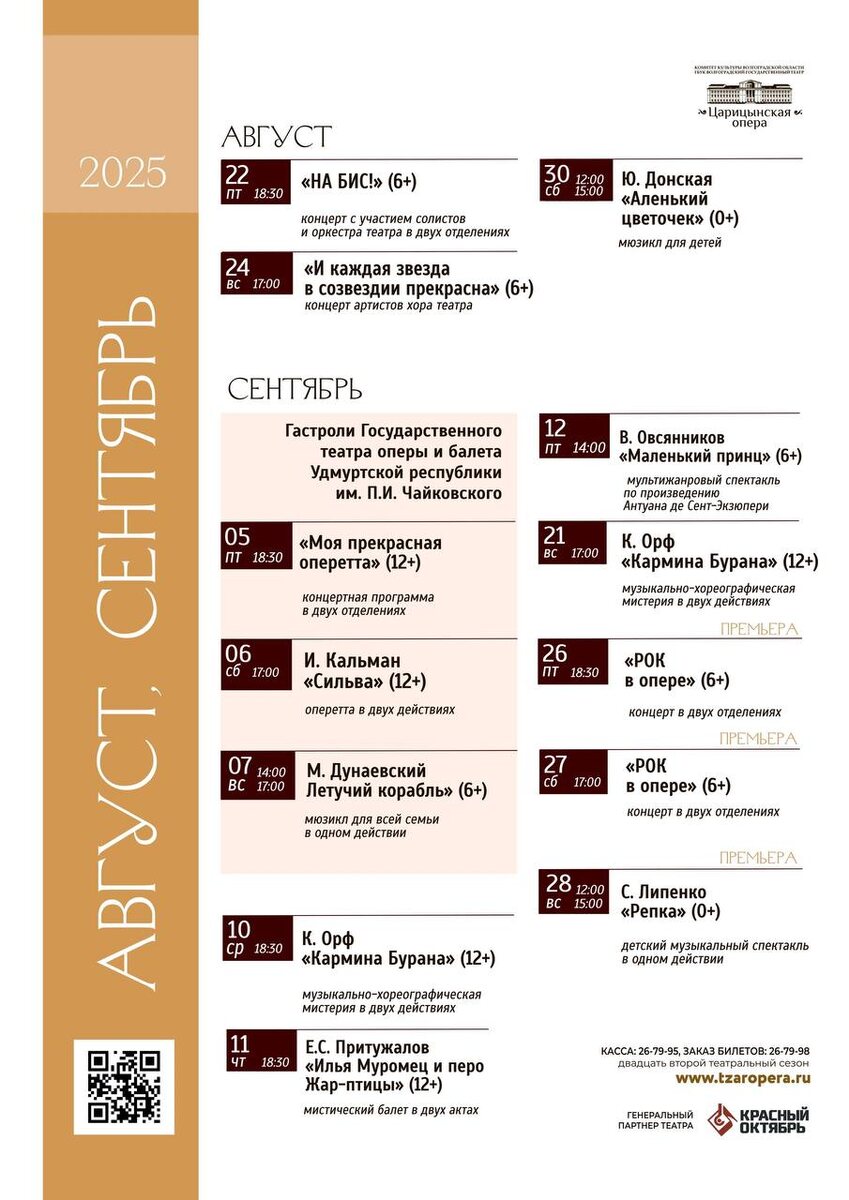 Дорогие зрители! 💜 Афиша мероприятий театра на начало 22 театрального сезона готова! Билеты можно приобрести на официальном сайте театра! По многочисленным просьбам зрителей открываем сезон 22 августа в 18:30 концертом "НА БИС!", который получил множество положительных откликов зрителей. 5, 6 и 7 сентября мы принимаем у себя в гостях Театр Оперы и Балета УР. Гастроли организованы РОСКОНЦЕРТ в рамках федеральной программы "Большие гастроли", согласно Всероссийскому гастрольно-концертному плану Министерства культуры Российской Федерации. В сентябре мы подготовили новый концерт "РОК в опере", а маленьких зрителей ждет премьера детского музыкального спектакля "Репка" (композитор С. Липенко). Так же в афише театра на август-сентябрь месяц уже полюбившиеся зрителю спектакли! Будем рады видеть Вас в зрительном зале! #ЦарицынскаяОпера #большиегастроли