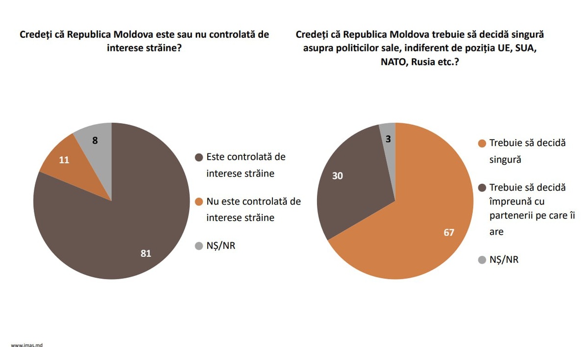 ⚡️🇲🇩Большинство граждан Молдовы считает, что страна контролируется извне По данным опроса IMAS, проведённого в июне 2025 года, 81% граждан считает, что Республика Молдова контролируется иностранными интересами, и только 11% считают, что решения принимаются независимо. Еще 8% не имеют четкого мнения. На вопрос о том, должна ли страна самостоятельно определять свою политику, независимо от позиций международных партнеров, 67% ответили, что Молдова должна принимать решения самостоятельно. ☝️😐Очень жаль, что в Молдове под независимостью понимается то, что действия властей никак не зависят от воли народа… @eNewsmd.online 👈 Подписывайтесь на наш канал