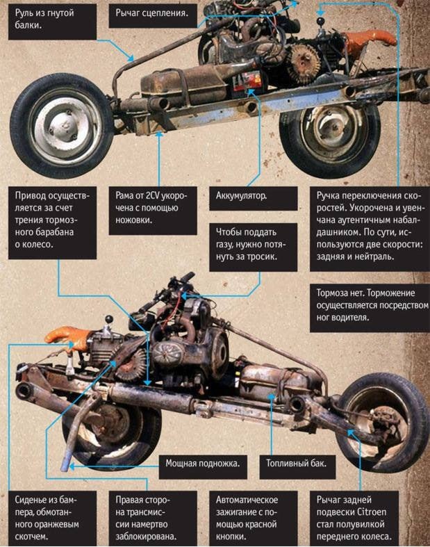 🗣В далёком 1993 году француз Эмиль Лерай застрял посреди африканской пустыни и стал синонимом человеческой изобретательности. Эмиль на своём авто Citroën 2CV отправился в одиночное путешествие по Марокко, но объезжая военный блокпост в хлам повредил подвеску. Находясь посреди пустыни в 30 километрах от цивилизации, он решил не топать по жарким пескам ногами, а вместо этого превратил разбитую машину... в МОТОЦИКЛ. С помощью инструментов, которые у Эмиля были с собой, он за 12 дней укоротил ходовую часть, установил два колеса, перенес двигатель в центр и даже соорудил сиденье из бампера. Всё это время гений экономил запасы еды и воды и разгуливал в нижнем белье (в пустыне жарко). Самое угарное: на самодельном байке Лерай добрался до цивилизации, где вместо похвалы за изобретательность словил штраф в 450 евро от полиции за управление незарегистрированным транспортным средством. Сейчас переделанный Citroën кочует по музеям как символ человеческой изобретательности в экстремальных усло