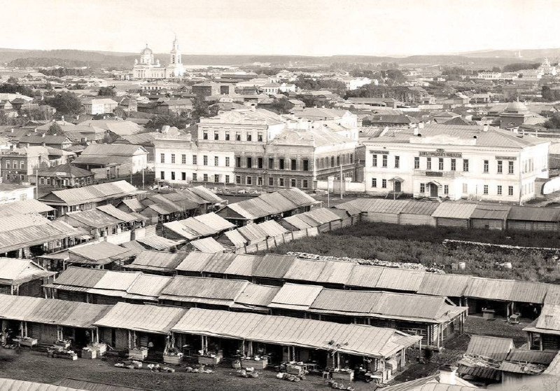 Юго-восточная панорама Екатеринбурга с пожарной каланчи 📸Фотография датируется 1885-1886 годами, её автором считается В. Метенков. ❗️Ближе к переднему плану снимка можно рассмотреть так называемый Зеленый рынок, размещавшийся вдоль современной улицы Малышева между рекой Исетью и храмом Большой Златоуст. Своё название рынок получил из-за того, что на нем крестьяне сбывали свои излишки: овощи, фрукты и прочие товары. К примеру, в те годы поросенок стоил 45 копеек, мука первого сорта (16 кг) продавалась за 1 рубль 20 копеек, высококачественная говядина — 2 рубля 20 копеек за пуд, сотня яиц обходилась в 1 рубль 30 копеек, сливочное масло — в 8 рублей за пуд, а сахар стоил 6 рублей 20 копеек. Для сравнения: рабочие того времени зарабатывали от 80 копеек до 1,5 рубля в день — сумма зависела от квалификации. Этих средств обычно хватало не только на ежедневные нужды, но и на небольшие запасы впрок. 💬С наступлением XX столетия большинство горожан уже не имели собственных огородов, поэтому
