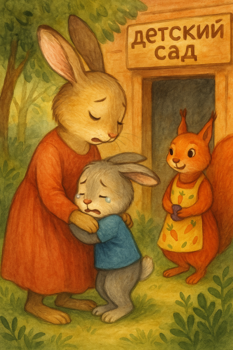В тёплом лесу, где каждая тропинка знала чьи-то шаги, жил маленький Зайчонок по имени Тёма, для которого мама была всем на свете. Он был весёлый, любопытный и очень-очень любил играть с мамой-Зайчихой. Больше всего на свете он обожал, когда они вместе читали сказки, лепили пирожки из пластилина и строили шалаш из подушек. Но однажды мама сказала: — Тёмочка, завтра ты пойдёшь в детский сад! Там будет весело: много новых друзей, интересные игры и даже вкусные завтраки! Зайчонок насторожил ушки. — А ты будешь со мной? — тихонько спросил он. — Нет, солнышко, я буду работать. Но вечером обязательно приду за тобой, — ласково улыбнулась мама и обняла Тёму. Зайчонок нахмурился. Ему совсем не хотелось идти в садик. В груди зашевелился тревожный комочек: А вдруг там скучно? А если никто не захочет с ним играть? А если воспитательница будет строгая? На следующее утро Тёма крепко вцепился в мамину лапку. Его сердце стучало, как барабан. — Мама, не уходи… — прошептал он, прячась за её пушистый бок