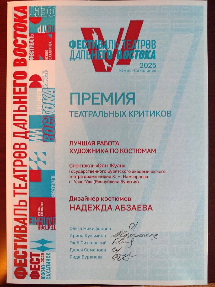 Спектакль Буряад театра «Дон Жуан» получил две премии театральных критиков России В Южно-Сахалинске завершился фестиваль театров Дальнего Востока. На церемонии закрытия фестиваля спектакль «Дон Жуан», представленный артистами Государственного Бурятского академического театра драмы имени Х.Н. Намсараева, получил сразу две премии от театральных критиков. Эксперты отметили как лучший дуэт исполнителей главных ролей — Бато Шойнжонова и заслуженную артистку Республики Бурятия Дарию Шагдурову, сыгравших Дон Жуана и Сганарель. Лучшим художником по костюмам признали известного бурятского дизайнера Надежду Абзаеву, которая разработала стильные оригинальные образы для постановки.