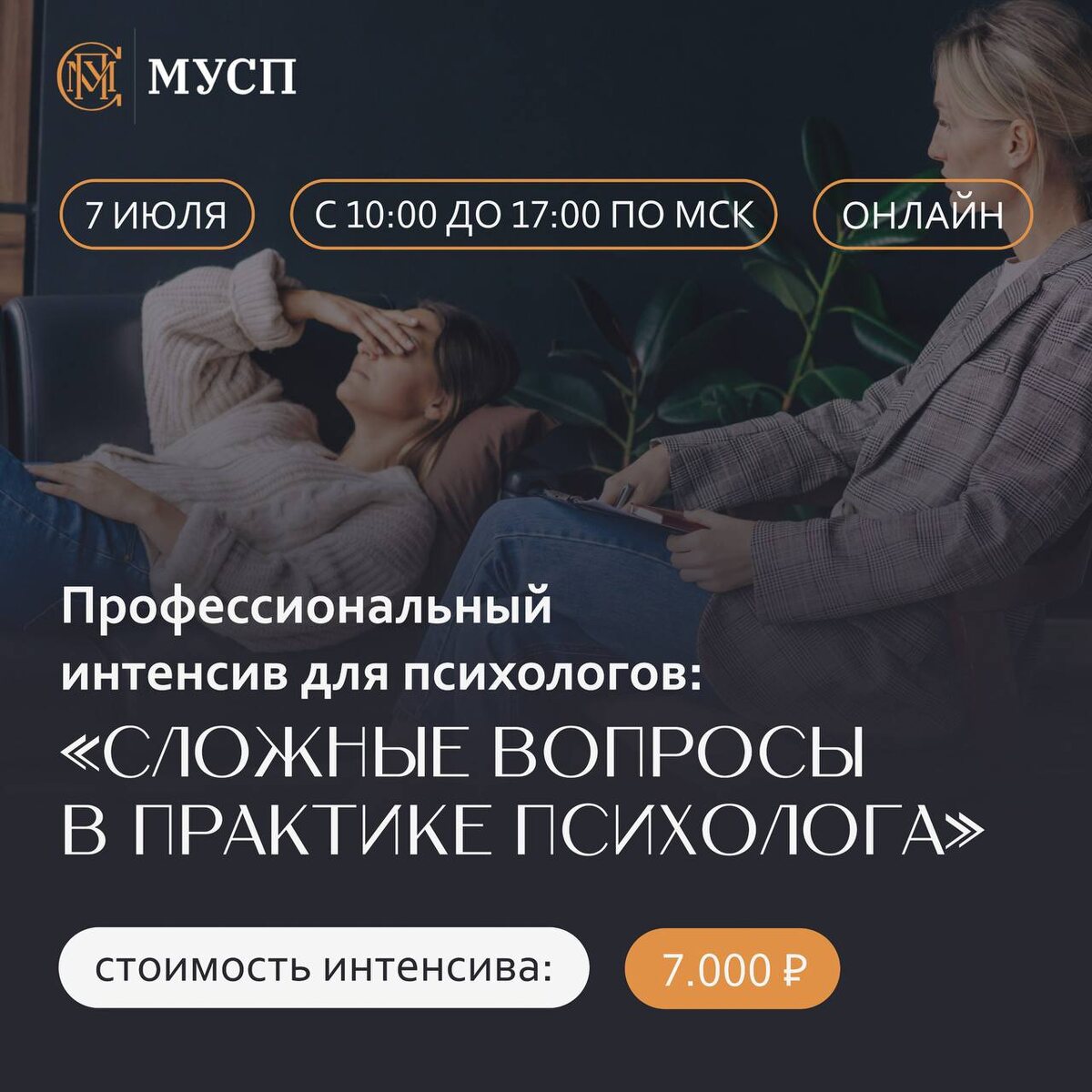 ⏺«Я не вижу смысла жить», — говорит клиент. А что говорите вы? Знакомая ситуация? Сердце учащается, в голове пустота, а профессиональная уверенность куда-то испаряется... ▶️7 июля с 10:00 до 17:00 МСК — интенсив, который изменит вашу практику навсегда. «Сложные вопросы в практике психолога» от Международного Университета Современной Психологии ❓Что будет на интенсиве: ✔️ Алгоритмы оценки суицидального риска — без паники и догадок ✔️ Техники деэскалации агрессии и манипуляций — сохраняем границы и спокойствие ✔️ 15+ этически спорных ситуаций — разборы с готовыми скриптами ✔️ Техники саморегуляции после сложных сессий — профилактика выгорания Ведут эксперты: 7⃣Абросимов Илья — кандидат психологических наук, клинический психолог, доцент МУСП 7⃣Прошина Маргарита — карьерный психолог, коуч, клинический психолог, преподаватель МУСП ЭКСКЛЮЗИВНО для подписчиков канала Университета! Промокод МУСП — скидка 50% Цена всего 3500₽ вместо 7000₽ Что получите уже после интенсива: ✔️ Готовые инс