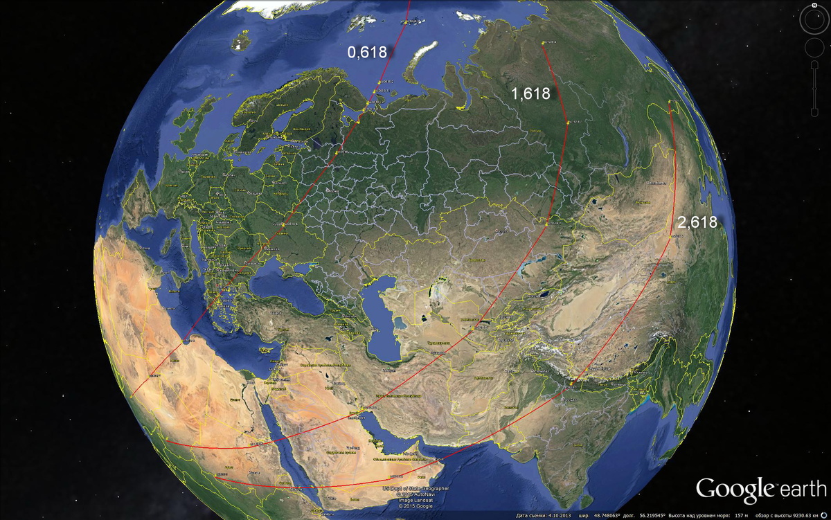 Напомним об интересной закономерности расположения Кайласа, связанной с его координатами. Координаты точки на перевале Сердунг Чуксум 31.058926°, 81.313320°, отношение долготы к широте дает 2,618… Это число связано с золотым сечением, точнее является квадратом Ф=1,618033989…. Небольшая разница возникает в седьмом знаке после запятой… Вот такое «совпадение». Видимо, далеко не случайно за нулевой меридиан принят Гринвичский меридиан, проходящий через обсерваторию в Гринвиче, на юго-востоке Лондона. Кстати, если отсчитывать нулевой меридиан от пирамиды Хеопса, линия золотого сечения географических координат проходит в относительной близости от Кайласа, но через менее значимые вершины. На поверхности планеты можно провести линии, точки которых будут иметь координаты, отношения долготы к широте которых равны 0,618; 1,618; 2,618. На рисунке ниже проведены приблизительные линии, соответствующие отношению долготы к широте 0,618; 1,618; 2,618.