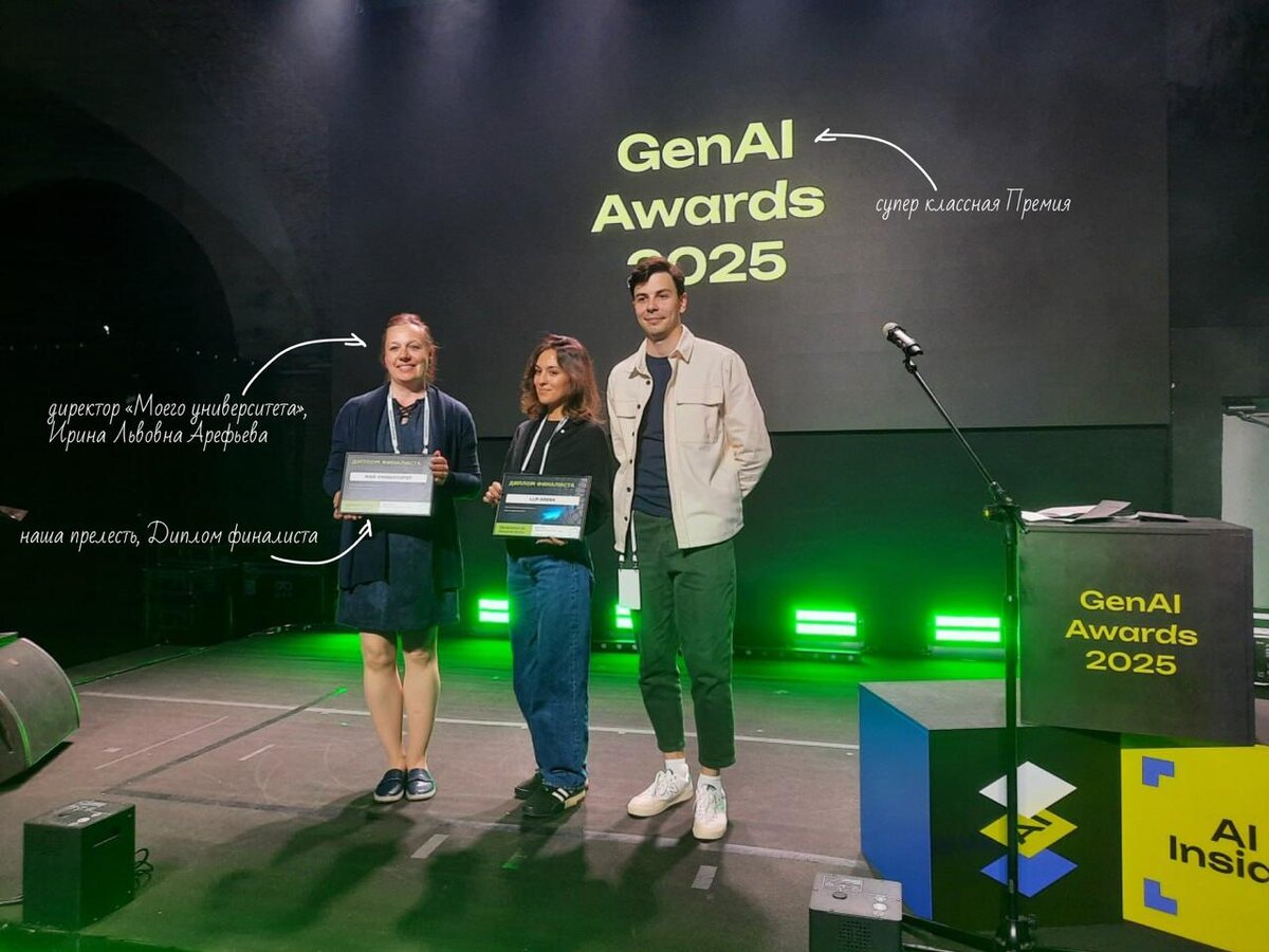 ⚡️Сначала боялись. Потом делали. Теперь «Мой университет» — финалист премии Generation AI Awards 2025! Друзья, хотим поделиться хорошими новостями и тёплыми эмоциями. Наш проект «ИИтоги будущего» вошёл в тройку лучших на первой российской премии Generation AI Awards 2025, которая прошла в Санкт-Петербурге. За 2,5 года мы провели курсы и мастер-классы, собрали базу кейсов и вырастили целый этаж, посвящённый ИИ, в нашем «Виртуальном музее современного образования». Сегодня наш проект оказался в одном списке с такими гигантами, как Авито, СберОбразование, Северсталь и другими. Это звучит громко — но для нас главное, что он действительно помогает учителям здесь и сейчас. 😊 Это большое событие для нас — за ним стоят живые люди: ⏺мы, команда «Моего университета»; ⏺вы, педагоги, которые нас вдохновляют и подталкивают к развитию; ⏺и, конечно, организаторы, эксперты и участники Премии. 〰️И всем мы говорим — большое человеческое спасибо! Команде — за упорство, креативность, понимание и под
