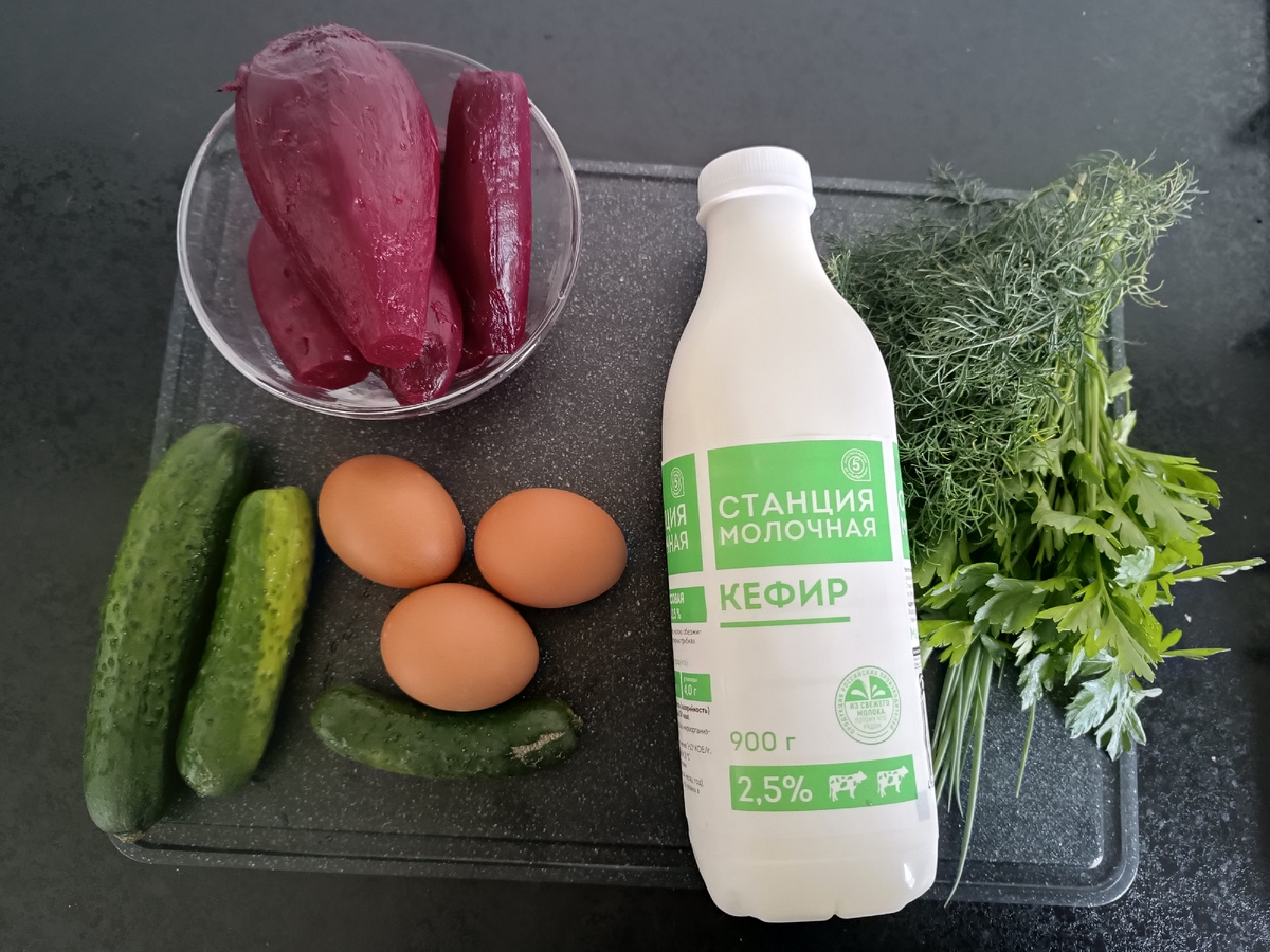 Здравствуйте, дорогие друзья! Сегодня предлагаю вам приготовить вместе со мной легкий и вкусный летний суп – «Холодный свекольник». Много времени на его приготовление не требуется, а получается очень полезно и малокалорийно. Как всегда Нам потребуются: Свекла, Огурцы свежие, Яйца, Кефир, Зелень – укроп, петрушка, зеленый лук. Соль, вода. У меня свекла молодая, уже со своего огорода, а поэтому особенно вкусная! Свеклу отварить или запечь, яйца отварить вкрутую. Свеклу очищаем, натираем на крупной терке, яйца и огурцы режем некрупным кубиком. Зелень измельчаем. Все это смешиваем, заливаем кефиром, солим. Если получилось очень густо – добавляем воду. Желательно дать свекольнику настояться хотя бы полчаса в холодильнике. Подаем с чесночными гренками. Попробуйте, это очень полезно и вкусно!