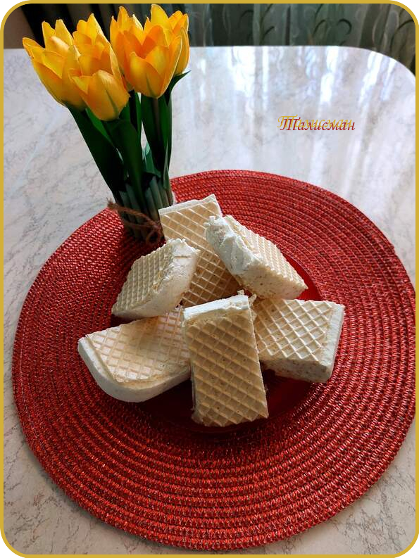На дно формы, выстеленной вафельным коржом (или слоем любимого печенья, для ещё большего удовольствия), выложите ровным слоем эту воздушную массу. Накройте вторым вафельным коржом, словно укрывая сокровище.