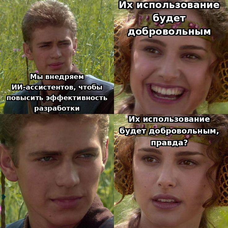 Проще говоря, если ты игнорируешь Copilot и предпочитаешь думать своей головой — будь готов к неудобным вопросам на ревью. И да, по слухам, речь идет о введении формальных метрик в оценку производительности уже со следующего финансового года.