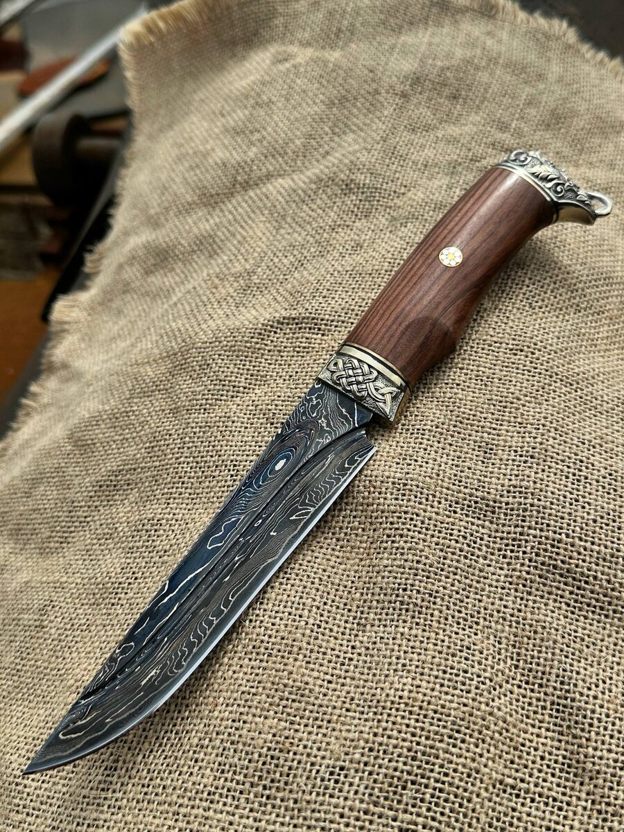 В свободной продаже нож «Сапер» из сложного ламинированного дамаска с воронением на клинке и фигурными долами. Сталь прочная на излом и долю держит заточку. Рукоять на ноже выполнена из мельхиора и палисандра с мозаичным пином. Анатомическая форма рукояти ю. Нож режет как бритва. Твердость клинка (HRC): 23.560 рублей, со скидкой: 20.026 рублей. В комплекте идут ножны из натуральной кожи. Для заказа писать на @Nazarklinokbot или по тел +79101343831 WhatsApp/Viber