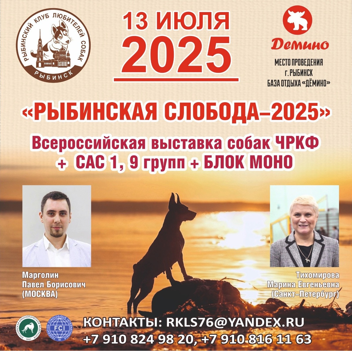 ⏰ 13 июл (7д) 🏛 #Демино #РыбинскийРайон #Ярославль #Россия #Выставка 🐶 Выставка собак: Рыбинская слобода - 2025 🏆 Клуб Любителей Собаководства Контакты организаторов здесь: 🌐 https://www.petsman.ru/vystavki-sobak.php?mesto=4370-demino Выставка собак всех пород ранга САС ЧРКФ "Рыбинская слобода-2025" САС 1 и 9 групп Монопородные выставки Американский бульдог Бернский зенненхунд Басенджи Вельш-корги пемброк Немецкий дог Цвергпинчер/пинчер Стаффордширский бультерьер Эрдельтерьер. ТЕСТИРОВАНИЕ ПОВЕДЕНИЯ 🧑 👨 Эксперты: 🔹 Марина Тихомирова 🔹 Павел Марголин