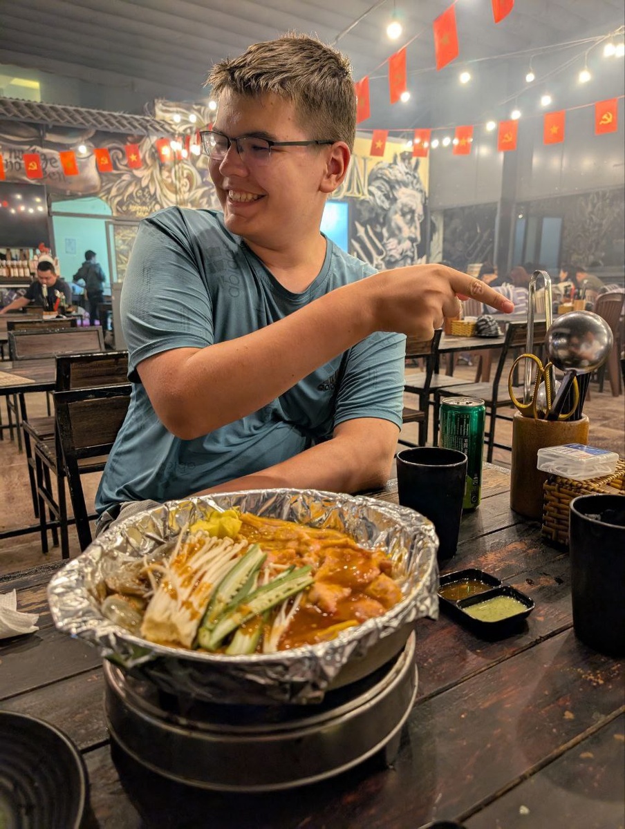 Ужин. Далат. Вьетнам. 02.07.2025 Отель находится на отдалении от цивилизации, от этого не большой выбор, где поужинать. Рядом единственное кафе "местного" характера. Работают молодые пацаны лет по 14-15. Саше понравилось, а мне не особо. Блюдо состояло из нескольких. Жареное на сковороде мясо с грибами и овощами, рис, бульон с рыбой и овощами и лапша. Принесли горелку, поставили на стол, на нее сковородку с сырыми продуктами и ушли. Продукты жарятся, мы их переворачиваем, типа готовим. Потом понимаем, что уже вроде готово. Но как-то мало на семью. Когда мясо съели, оказывается ещё рис к нему должен идти, забыли. Принесли. Острый. Убрали сковородку, поставили кастрюлю с бульоном. Вот мы сидим ждем, когда этот бульон закипит, чтобы туда подложить рыбу. Овощи сырые к тому времени уже тоже доели, потому что есть хотелось. Вода закипела, рыбу сварили, но про лапшу опять забыли. Короче, не понравился сам подход и "ненавязчивый сервис", так пишут, когда хотят сказать, что официанты