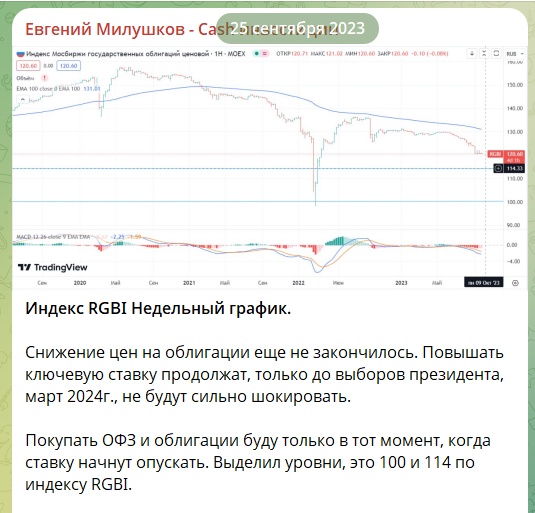 Всех приветствую. Есть основной индекс RGBI, который показывает ценовую стоимость гос. облигаций. В случае снижения ставки, индекс растет, в случае роста, снижается. Начну с того, что все цели по снижению индекса RGBI были выполнены. Пост от 2023г. Тогда ставил для себя цели это 114 и 100п. На тот момент индекс был на отметке 120п После пост от 2024г., где указал на снижение до 100п. Что сейчас? В июне 2025г. был слом нисходящего тренда, закрепились выше и дошли до первой цели 114-115п. Так же среднесрочно сформировали восходящий тренд и пока он не будет пробит индекс продолжит свой рост. На текущий момент ставлю для себя цель 128-130п.