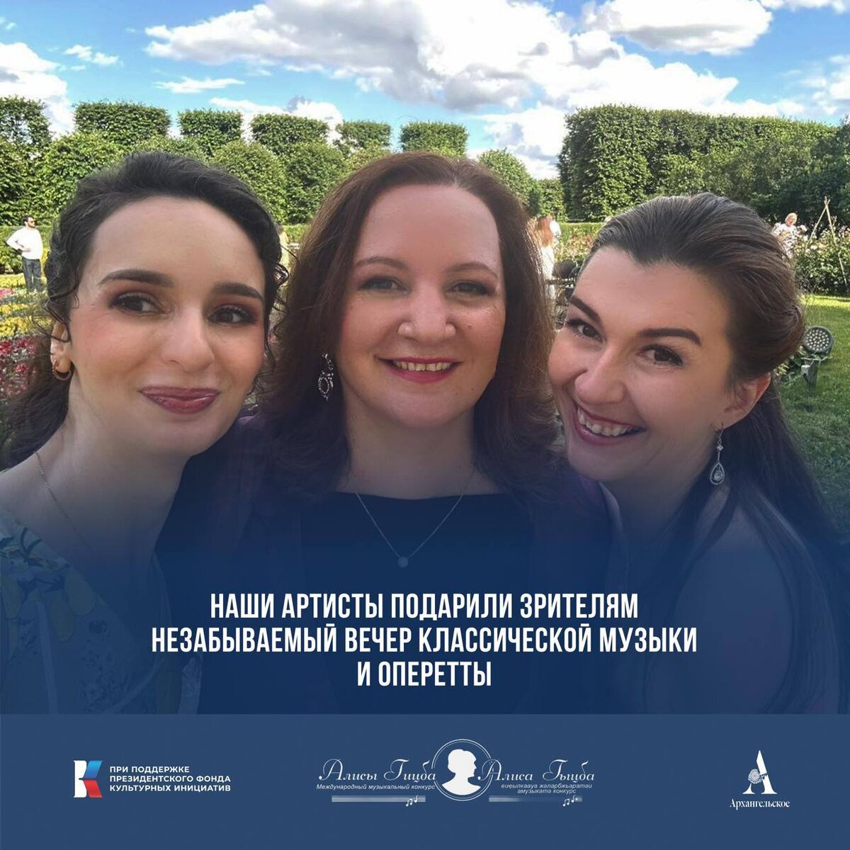 🤗🤭 Алиса Гицба, Юлия Герасимова и Маргарита Шелухина выступили в живописнейшем саду музея-заповедника «Архангельское», подарив зрителям незабываемый вечер классической музыки и оперетты. Концерт лауреатов конкурса «Подмосковные вечера: Оперетта и кино» — уникальное событие, которое объединило искусство исполнения с очарованием природной красоты подмосковного загородного парка. Музыка звучала в гармонии с шелестом листьев и ароматами цветов, создавая атмосферу волшебства и романтики. Это удивительное сочетание позволило публике насладиться живым исполнением произведений великих композиторов, погрузившись в особую атмосферу камерного концерта под открытым небом. Зрители были восхищены высоким уровнем мастерства исполнителей и атмосферой сада, ставшей идеальным фоном для музыкального действа. Концерт прошел в рамках проекта «Международная музыкальная лаборатория Алисы Гицба», поддержанного Президентским фондом культурных инициатив, что подчеркивает значимость мероприятия в культурном