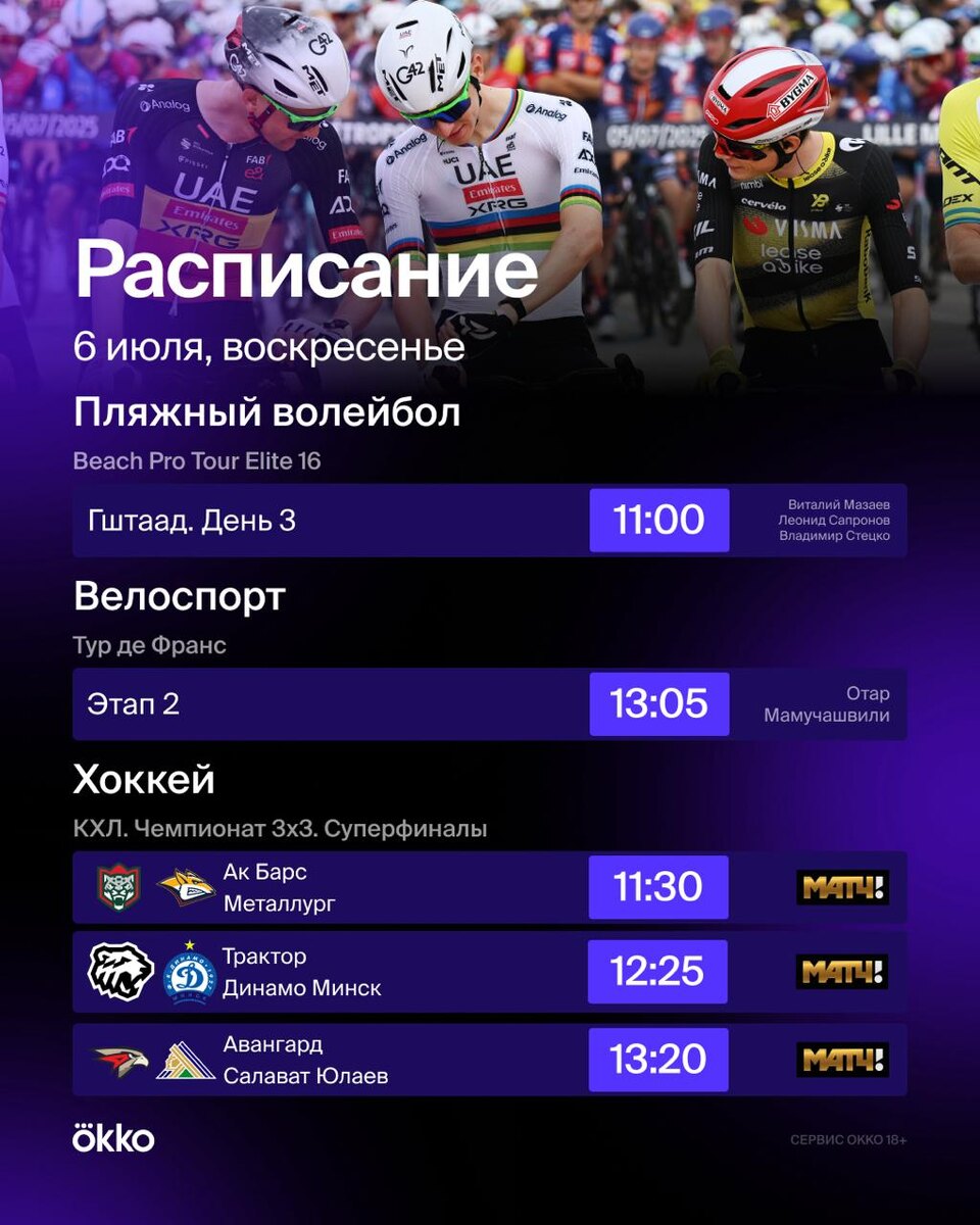 Пляжный волейбол, второй этап «Тур де Франс» и хоккей 3х3. Такое расписание на сегодня 📌