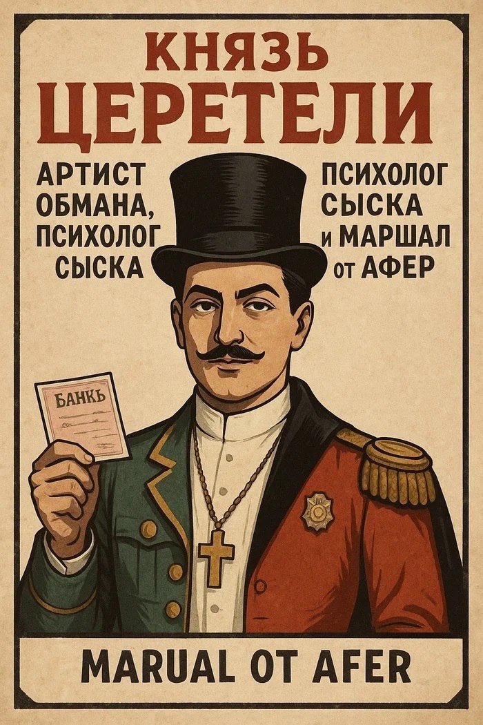 Князь Церетели: артист обмана, психолог сыска и маршал от афер! Знаете, друзья, что отличает русского афериста от иностранного? Француз подделает чек — и скрывается. А наш — подделает банкирский орден, вручит его продавцу и заберёт чековый бланк на сдачу! Вот он, многоликий князь Церетели. Человек с тысячью паспортов, титулов и личин. – Утром он — прапорщик милиции, – днём — персидский принц с лакеем, – а вечером — революционер-издатель с Куприным в подвале. Церетели не просто обманывал — он создавал атмосферу доверия плотностью 1024 мм ртутного столба. Князь? Да, конечно! Снял особняк с видом на море, купил собаку, нанял ветеринара. Всё — чтобы шубу даме продать и сбежать с кассой. В банках он был как дома. Буквально: — сам себе открывал двери, — сам себе выписывал чеки, — сам себя потом и ограблял. И ведь не просто крал! Он философствовал: «Банки — это как казино. Только там клиентов раздевают с улыбкой. Я просто беру своё. С интересом». Вы думаете, он сидел? Конечно, сидел — н