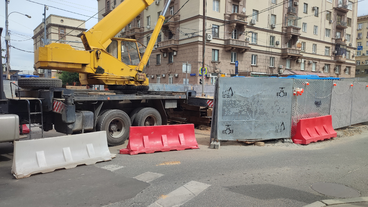 Перекрытый участок Сущёвского Вала у Новорижской эстакады. Идёт укладка путей от площади в сторону Гиляровского.