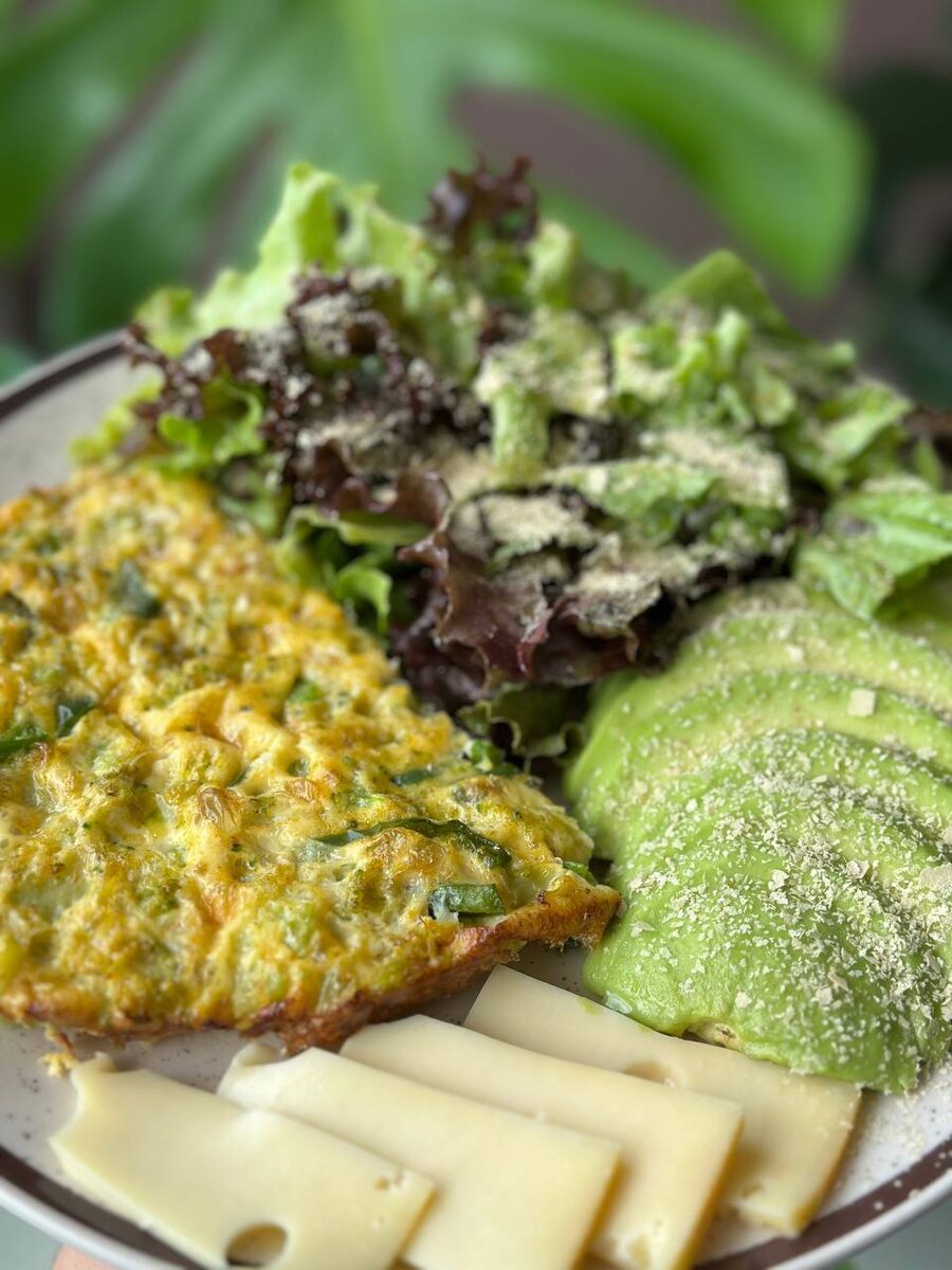 Мой воскресный завтрак: •Фритатта •Авокадо •Сыр •Зелень (заправка: оливковое масло + песто + дрожжи) РЕЦЕПТ ФРИТАТЫ⬇️ Ингредиенты: • Сыр 15% — 30 г • Лук — ¼ шт • Болгарский перец — ½ шт • Яйца — 4 шт • Шпинат — 1 пучок • Соль и перец — по вкусу • Масло для жарки (я использую гхи) — 1 ч. л. • Петрушка и зелёный лук — для сервировки Приготовление: 1. Разогрейте духовку до 200°C. Пока она нагревается, мелко покрошите красный лук и нарежьте болгарский перец кубиками. 2. На разогретой сковороде с добавлением масла обжарьте лук. Готовьте 3–4 минуты, помешивая, пока он не станет мягким. 3. Добавьте болгарский перец, готовьте ещё 3 минуты, затем добавьте шпинат. Приправьте всё солью и перцем по вкусу. 4. В миске взбейте яйца с солью и перцем. 5. Добавьте в яичную смесь обжаренные овощи и натёртый сыр. Хорошо перемешайте. 6. Вылейте получившуюся массу в форму и поставьте в духовку. Выпекайте около 15 минут — до тех пор, пока середина не застынет. Подавайте, украсив свежей зеленью. ✅ Советы
