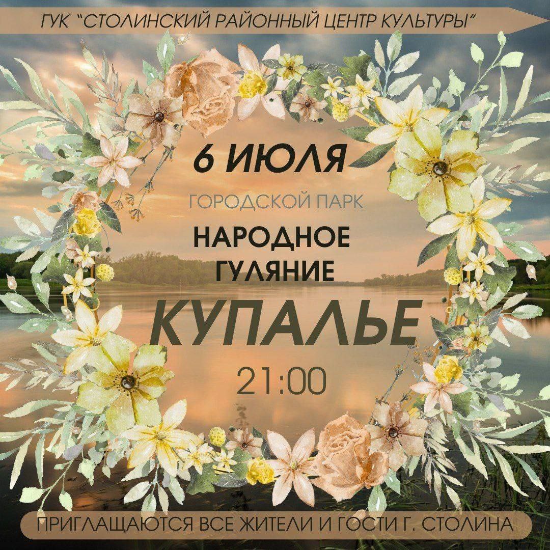 6 ліпеня 2025 г. у гарадскім парку г.Століна, на беразе ракі Копанец, адбудзецца традыцыйнае народнае свята "Купалле-2025". У праграме: 20.50 - 21.00 - святочнае тэатралізаванае шэсце да месца правядзення свята 21.00 - 22.30 Тэатралізаванае прадстаўленне "Купальскі карагод" з музычнымі нумарамі ад народных калектываў раёну 22.30 Урачыстає распальванне купальскага вогнішча. Купальскія карагоды. 23.00 - 01.00 Святочная купальская дыскатэка "Зажыгай на Купалье!” У час правядзення народнага свята будуць працаваць гандлёвыя рады