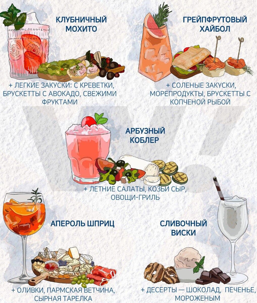 Топ-5 коктейлей со льдом 🍸Клубничный мохито. Хорошо сочетается с легкими закусками: например, с креветками, брускеттами с авокадо или свежими фруктами. 🍸Апероль шприц. Подайте с оливками, пармской ветчиной или сырной тарелкой — как делают в Италии. 🍸Арбузный коблер. Хорошо подать с летними салатами, козьим сыром или овощами-гриль 🍸Сливочный виски. Сочетается с десертами — например, с шоколадом, печеньем или мороженым. 🍸Грейпфрутовый хайбол. К этому коктейлю подойдут соленые закуски, морепродукты или брускетты с копченой рыбой.