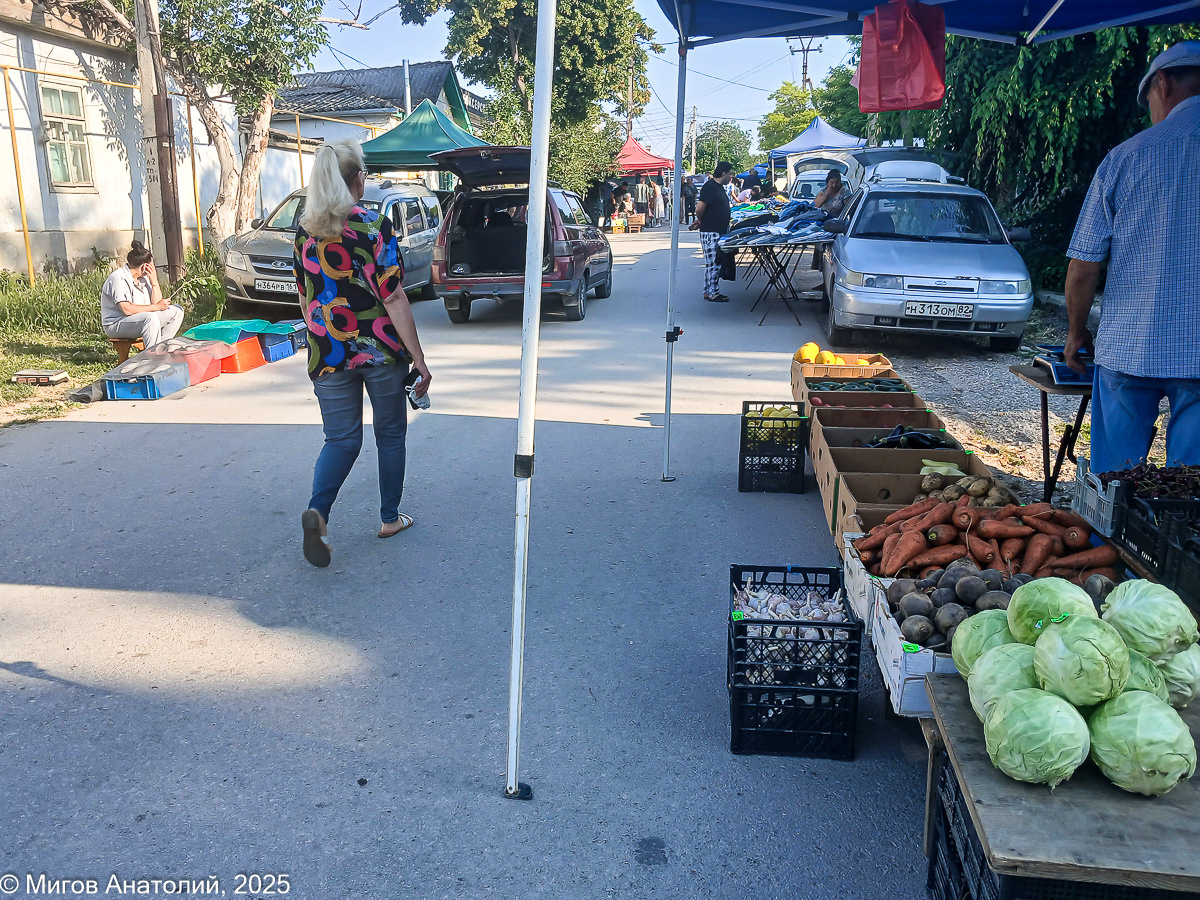 В 07:30 я уже на рынке. Как всегда по воскресеньям, торговля начинается ещё до входа в рынок. Продавцы паркуются на обочине и раскладывают товар на ящики и раскладные столики. Народу сегодня много. Жара всё таки пришла в наш городок Старый Крым. Днем температура поднимается до +30 и даже слегка выше. Так что многие люди приходят на рынок пораньше. Хотел сказать, "по утреннему холодку", но увы, уже в семь утра никакого холодка нет. Впрочем, в тени пока вполне комфортно. В торговых рядах встретил знакомого местного старожила. Он уже навстречу мне с покупками идёт. Говорит мне: - Ты тоже пораньше приходишь? Это правильно. А то придешь позже, а тут уже всё руками залапали и перемяли. Почему-то я никогда не смотрел с такой точки зрения. У меня три причины раннего похода на рынок: во-первых, сделал дело, гуляй смело; во-вторых, ранним утром не так жарко; в-третьих, с утра выбор больше, самые вкусные овощи-фрукты, которые приносят в малом количестве люди со своих огородов-садов, раскупаются в