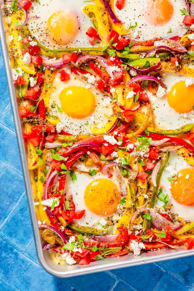 Сытный, полезный завтрак с минимумом уборки! Белок яиц + свежие овощи = заряд энергии. Легко подстроить под свои цели (ПП, кето, низкоуглеводная). Овощи - 3 разноцветных болгарских перца, 1 крупная красная луковица (можно заменить/добавить: кабачок, баклажан, помидоры черри, шпинат - летние варианты!) Масло оливковое 1-2 ст. л. Специи - 1 ч. л. тмина, 1 ч. л. паприки, 1 ч. л. сушеных трав (орегано/базилик), соль, черный перец по вкусу. Яйца - 6-8 крупных (Для ПП/низкокалорийного можно часть заменить белками) Дополнительно (по желанию) - сыр фета (30-50 г), свежая зелень (петрушка, кинза), авокадо. Духовку включить на 200°C. Противень застелить пергаментом или слегка смазать маслом. Перцы и лук нарезать. Смешать на противне с оливковым маслом, специями, солью и перцем. Запекать 10-15 минут до мягкости овощей. Сделать в овощах углубления. Влить в каждое по яйцу. Посыпать сыром фета (если используете). Запекать еще 5-8 минут до желаемой готовности яиц (жидкий или плотный желток). При