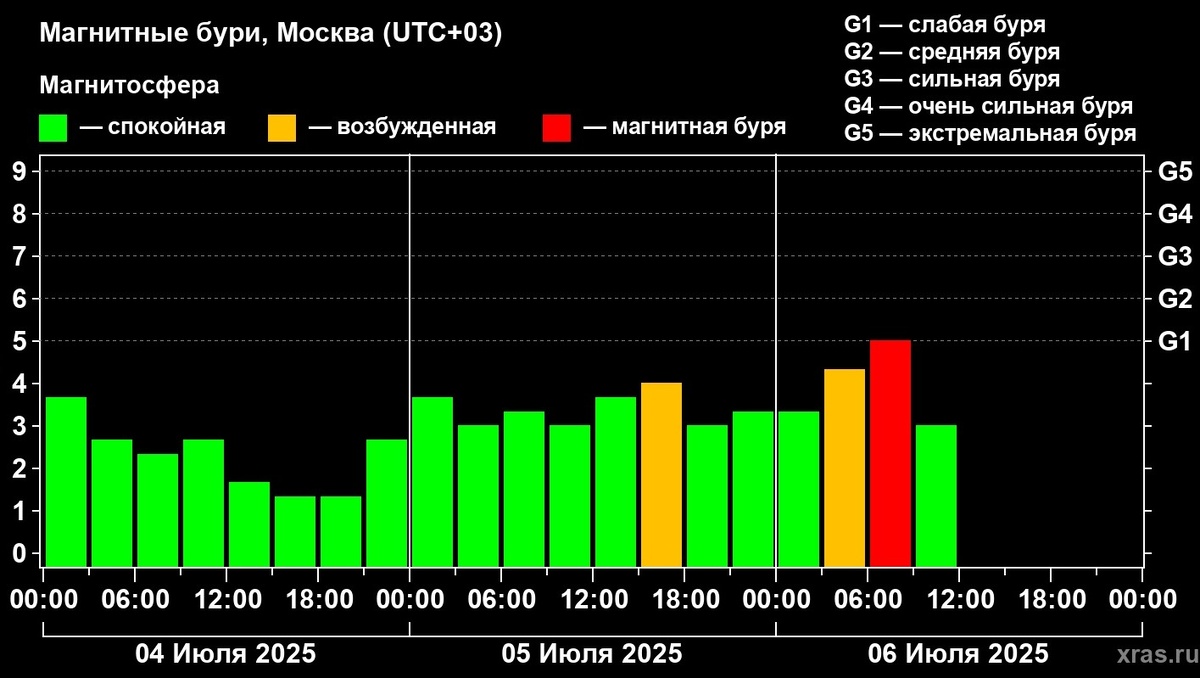 Сегодня, 6 июля, на Земле зафиксирована первая магнитная буря в этом месяце. Как сообщает Лаборатория солнечной астрономии ИКИ и ИСЗФ, буря была слабая и короткая, продолжалась с 6:00 до 7:00. "В конкретных причинах бури разобраться довольно трудно…Прогноз на ближайшие дни сохраняется полностью зелёным: как минимум до момента, когда очередной протуберанец всё же решит двинуться в сторону Земли, и все мировые центры (и мы тоже) начнут лихорадочно перекрашивать свои диаграммы в красные цвета", - сообщили астрономы в группе Лаборатории в ВК.