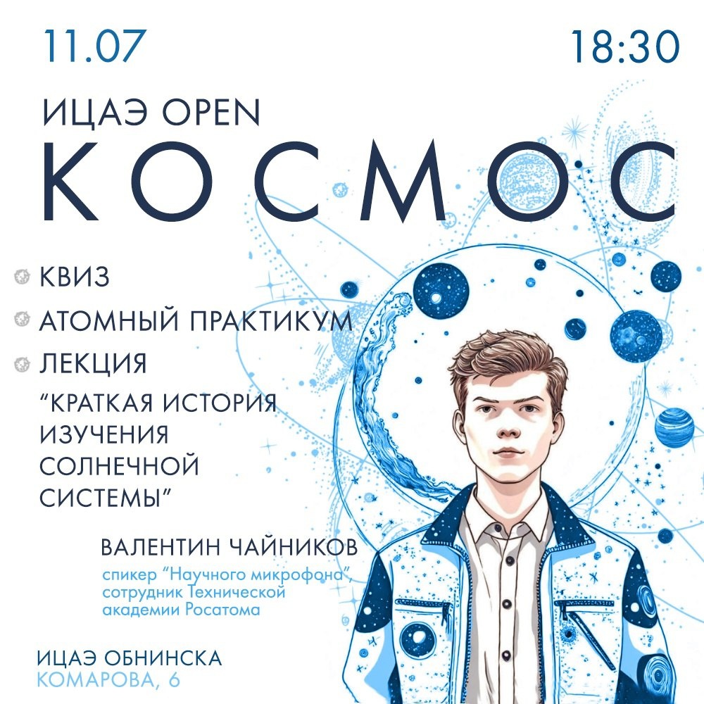 💫 Как человечество покоряло космос? Что нужно для дальних полётов в космическом пространстве? Как атомные технологии применяются в космической промышленности? Об этом и многом другом узнают гости ИЦАЭ Обнинска 11 июля в рамках «ИЦАЭ OPEN: космос» 🌠 ✨ Вечер начнётся в 18:30 с лекции «Краткая история изучения Солнечной системы» Валентина Чайникова - спикера Научного микрофона, сотрудника Технической академии Росатома. Он рассмотрит историю изучения и освоения Солнечной системы человечеством. Зрители узнают об основных открытиях, вехах, достижениях и применении атомных технологий в космической сфере. 🚀 После лекции пройдёт атомный практикум «Дальний космос». Участники практикума узнают, зачем ракетам ступени и почему химические двигатели не подходят для далёких полётов, какие решения предлагает атомная отрасль и есть ли шанс, что космонавты в полёте будут есть свежие фрукты. 💯 В завершение вечера пройдёт интеллектуальная командная игра «Адреналин: космос». 📌 «ИЦАЭ OPEN: космос»