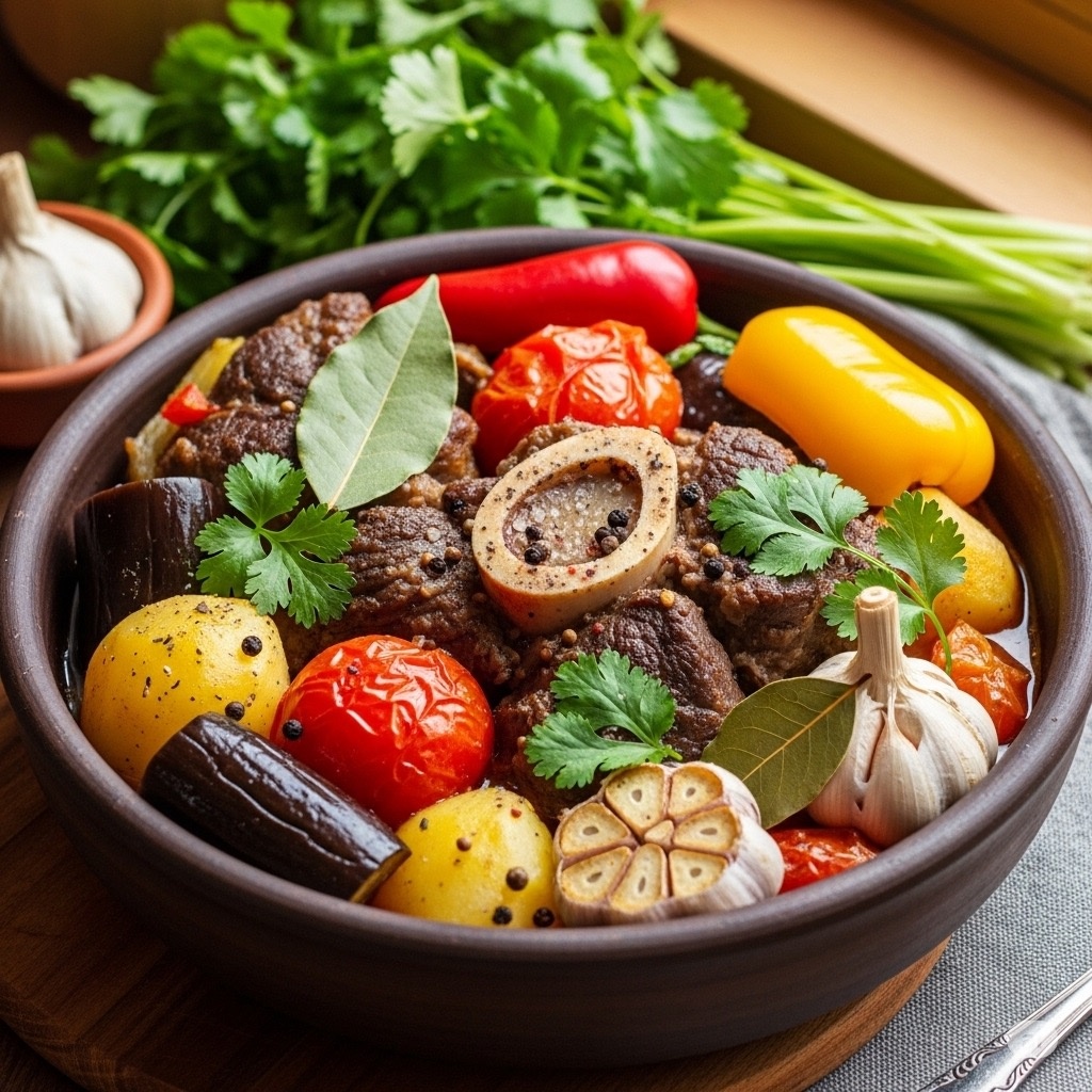 👉 Добавь лавровый лист, чеснок, оставшиеся специи, зелень. Влей в каждый горшочек по 3–4 ст.л. воды или бульона. Не заливай доверху — овощи и мясо пустят соки. Подавай прямо в горшочках, присыпав свежей зеленью и зернами граната (по желанию)