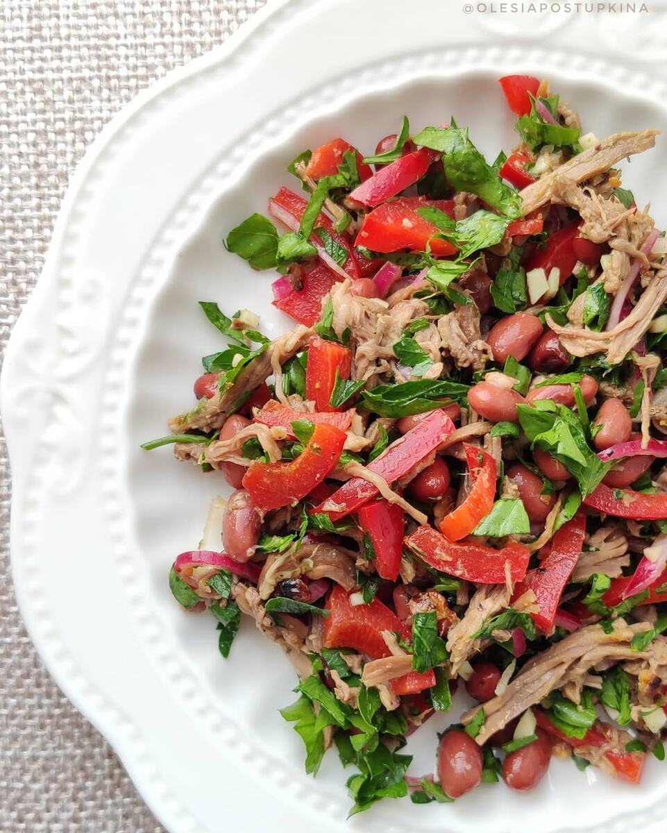 👍ОЧЕНЬ ПОНРАВИЛСЯ МНЕ САЛАТ "ТБИЛИСИ". И моим домашним тоже) А вы пробовали такой? Делюсь вкусным рецептом с КБЖУ❤️. С вас 💗💗💗, не забывайте🤗. Мне всегда приятна ваша обратная связь😘. ⠀ Выход 610г. ⠀ КБЖУ на 100г.:144/7.8/9.3/7.4 ⠀ Ингредиенты: - 160г отварной говядины (250г в сыром виде) - 30г кинзы или петрушки - 30г грецких орехов - 50г красного лука - 140г сладкого красного перца (1шт) - 20г подсолнечного масла - уксус - 10г чеснока (2 зубчика) - соль, перец, хмели-сунели - 160г красной консервированной фасоли (1 банка без жидкости). ⠀ Приготовление: Лук нарезать полукольцами или меньше, залить 9% уксусом и оставить на 15минут, потом немного промыть, отжать. Говядину разобрать на волокна, перец нарезать соломкой, фасоль промыть, орехи подсушить на сковороде и мелко порубить, зелень и чеснок измельчить. Всё соединить, посолить, поперчить, добавить масло и хмели-сунели и аккуратно перемешать. ⠀ Очень сытно и вкусно!!!!!! Рекомендую!! ⠀ #олеся_кашеварит #поступкина_салаты #сала