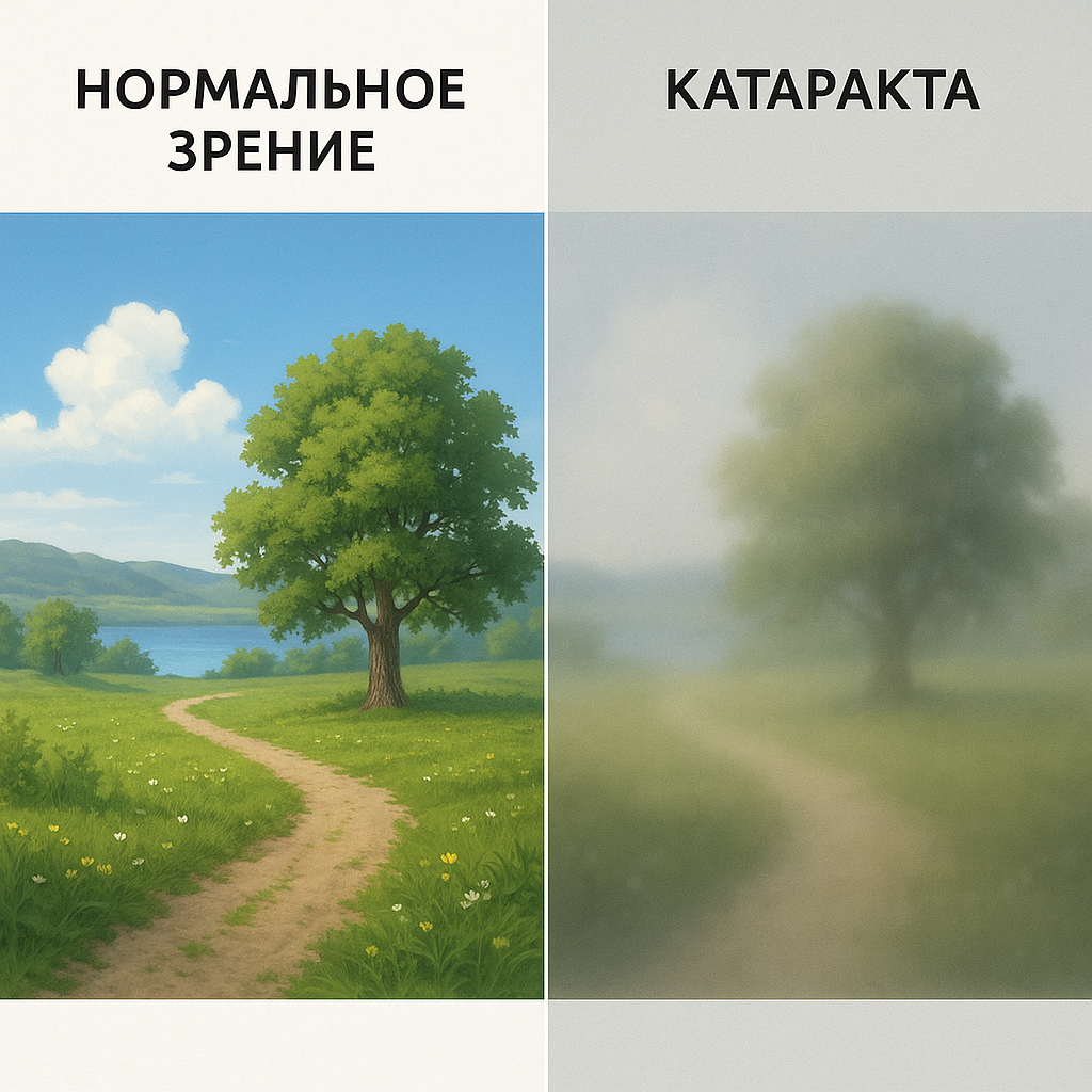 Катаракта — это помутнение хрусталика глаза. Хрусталик в норме — это прозрачная «линза» внутри глаза, через которую свет проходит на сетчатку. Когда хрусталик становится мутным, изображение теряет резкость, цвета тускнеют, и зрение постепенно ухудшается — как будто вы смотрите через запотевшее или пыльное стекло.
