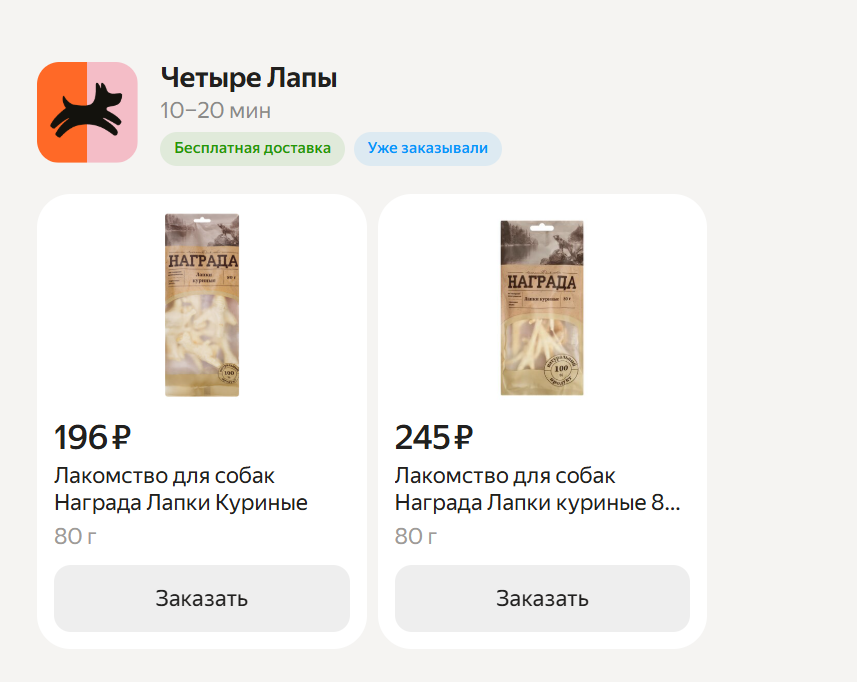 Не очень давно на канале, который читаю, увидела статью о том, что автор никогда и ни за что не станет есть куриные лапки. И, знаете, так детство вспомнилось… Не знаю, как у вас, а у меня кулинарная любовь может родиться из самого простого. Вот, например, те же куриные лапки, которые многие отрицают. Для одних — это просто собачье лакомство, вот смотрите, что по этому запросу показывает Яндекс Еда: