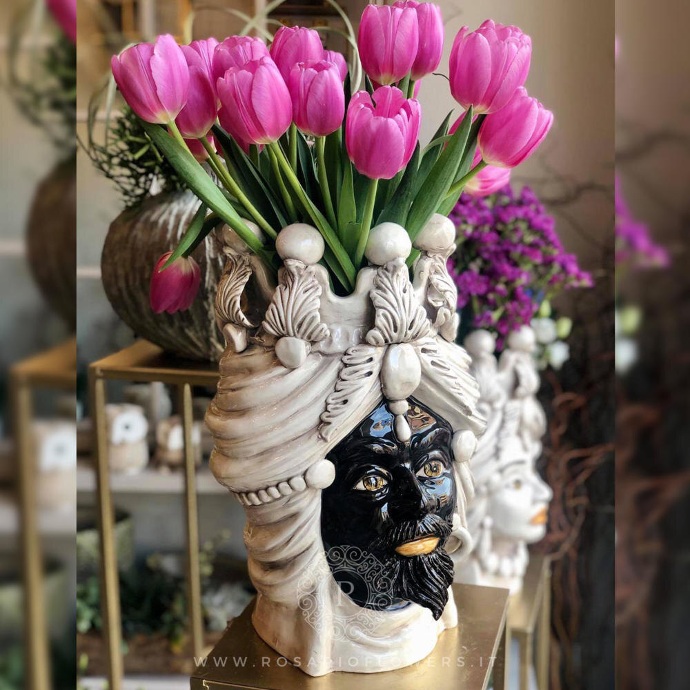 История сицилийских ваз-голов, известных как “Teste di Moro” (Головы мавров), уходит корнями в XI век, когда Сицилия находилась под арабским владычеством. Это одна из самых мрачных и романтических легенд острова. Согласно преданию, в районе Калса в Палермо жила прекрасная молодая девушка, которая проводила дни, ухаживая за растениями на своем балконе. Однажды ее заметил красивый молодой мавр - торговец, который мгновенно влюбился в нее. Он начал ухаживать за девушкой, и та ответила ему взаимностью, поверив в искренность его чувств. Влюбленные проводили вместе страстные дни и ночи, но девушка не знала, что у мавра на родине, в арабских землях, уже есть жена и дети, которые ждут его возвращения. Когда она случайно узнала об этом обмане, ее сердце наполнилось яростью и жаждой мести. В одну из ночей, когда мавр спал, девушка отрезала ему голову. Из черепа она сделала вазу, посадила в нее базилик и поставила на балкон. Растение, политое слезами обманутой любви, росло необычайно пышно и благ