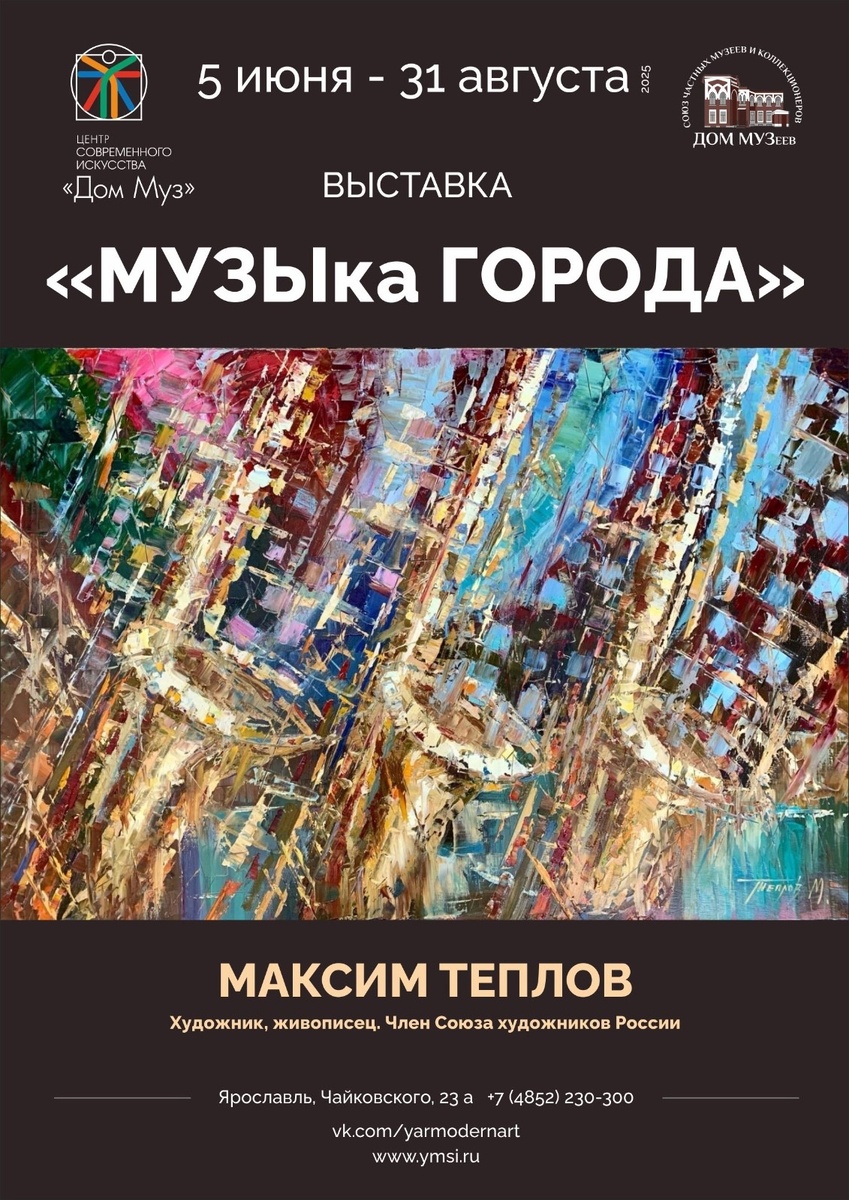 Центр современного искусства «Дом Муз» приглашает вас на выставку художника Максима Теплова, где город звучит, а музыка обретает очертания. Максим Валерьевич Теплов - художник, живописец, Член Союза художников России. С первых выступлений на выставках он заявил себя как художник городского пейзажа. Любимая тема творчества автора – изображение Ярославля. В создании образов Ярославля ему пригодилась профессиональная подготовка: умение рисовать, выстраивать перспективу улиц и площадей, грамотно писать архитектуру. Но важнее то, что родной город в картинах Максима Теплова узнается по неповторимой атмосфере, которую он смог уловить. Найдено им и цветовое отношение облаков, вечерних огней, отражений. И это не фантазия, не игра воображения, а живой современный Ярославль, пребывающий в постоянном движении – движутся люди, машины, сменяются времена года. В портретах любимого города удивительным образом сочетаются величие старины и стремительность настоящего. Так появилась серия работ, посвященн