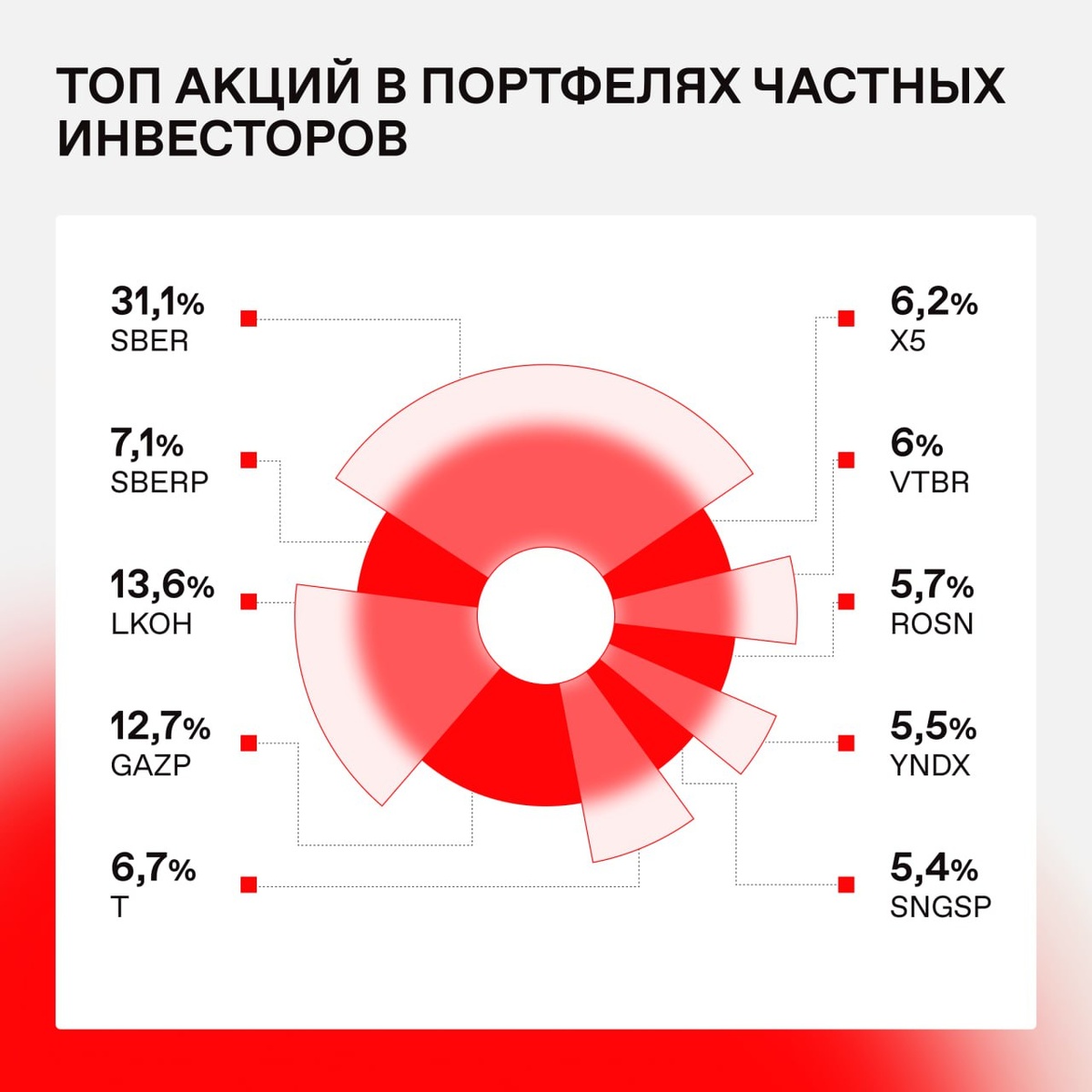 Как выглядит портфель акций РФ у среднего инвестора («народный портфель») на Мосбирже по итогам июня: 1. Сбербанк ао - 31,1% 2. Лукойл - 13,6% 3. Газпром - 12,7% 4. Сбербанк ап - 7,1% 5. Т-Технологии - 6,7% 6. X5 - 6,2% 7. ВТБ - 6% 8. Роснефть - 5,7% 9. Яндекс- 5,5% 10. Сургутнефтегаз ап - 5,4% Доля ВТБ существенно выросла, что позволило занять 7 строчку в рейтинге вместо 10-й в мае. В остальном изменений не было. Лишь незначительно изменились доли из-за рыночной переоценки. По секторам: Банки - 50,9% Нефтегаз - 37,4% Ритейл - 6,2% IT - 5,5%